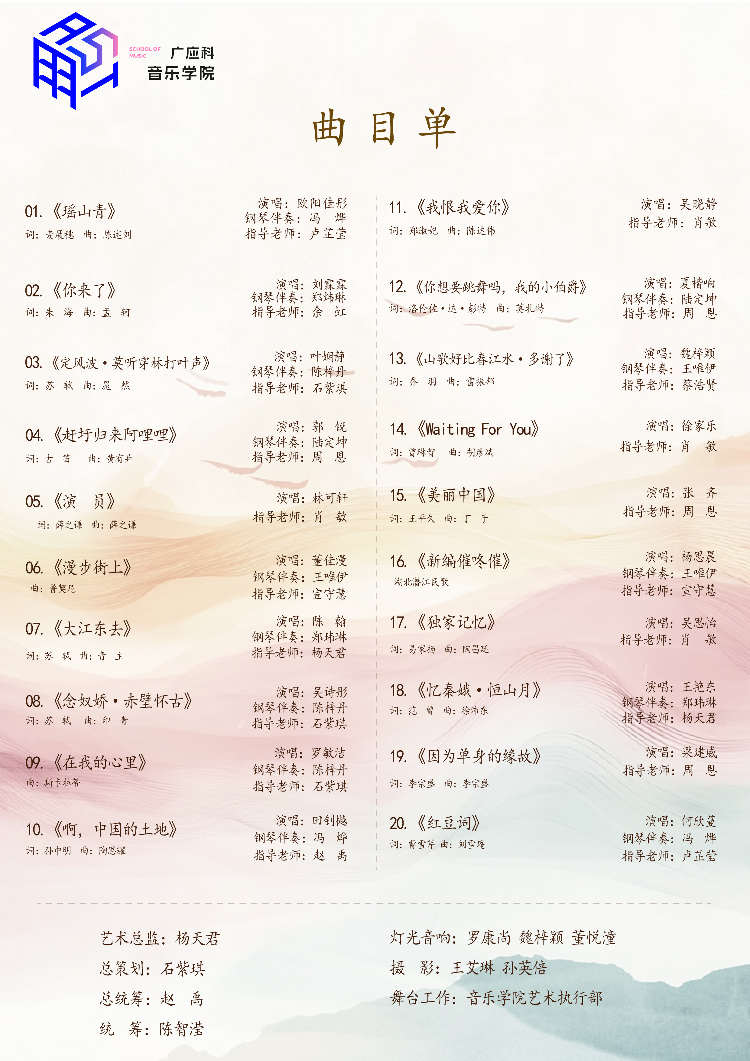 这场音乐会要特别感谢钢琴器乐教研室的倾情合作,全体钢琴老师们的的默默护航,为同学们的演唱赋予了更深的音乐内涵。陈梓丹老师、冯烨老师、王唯伊老师、郑玮琳博士,特别是陆定坤老师作为学院初创的参与者,一直是声乐、合唱团的钢琴指导,他们的悉心指导,让每一段演唱都更添感染力,直抵人心,体现了音乐学院音乐学院团结协作的“五个一”精神。