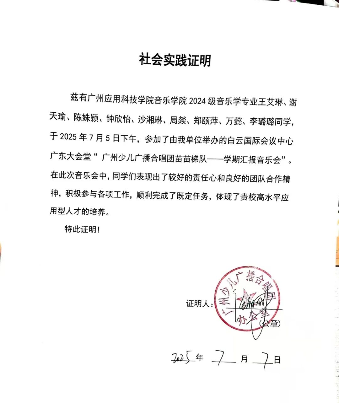 2025年7月5日下午,广州应用科技学院音乐学院的学子们积极参与社会实践活动,在白云国际会议中心为广州少儿广播合唱团基础梯队夏季音乐会提供舞台后台支持,展现了我院学生的专业素养与奉献精神,更体现了学院以学生为中心的应用型人才培养。