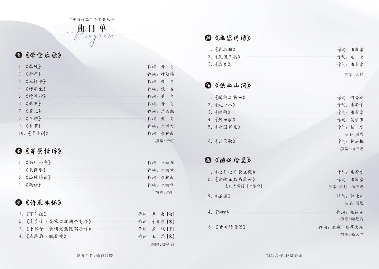 演出曲目紧扣“中国近代史”主题,覆盖黄自多元创作类型:既有传递启蒙力量的《学堂乐歌》,也有以李白、辛弃疾诗词谱曲的《下江陵》《南乡子》,更有《赠前敌将士》《天伦歌》等承载抗日精神与民族大爱的作品,以及呈现中国第一部清唱剧《长恨歌》选段,全面展现黄自作品的艺术价值与历史重量。