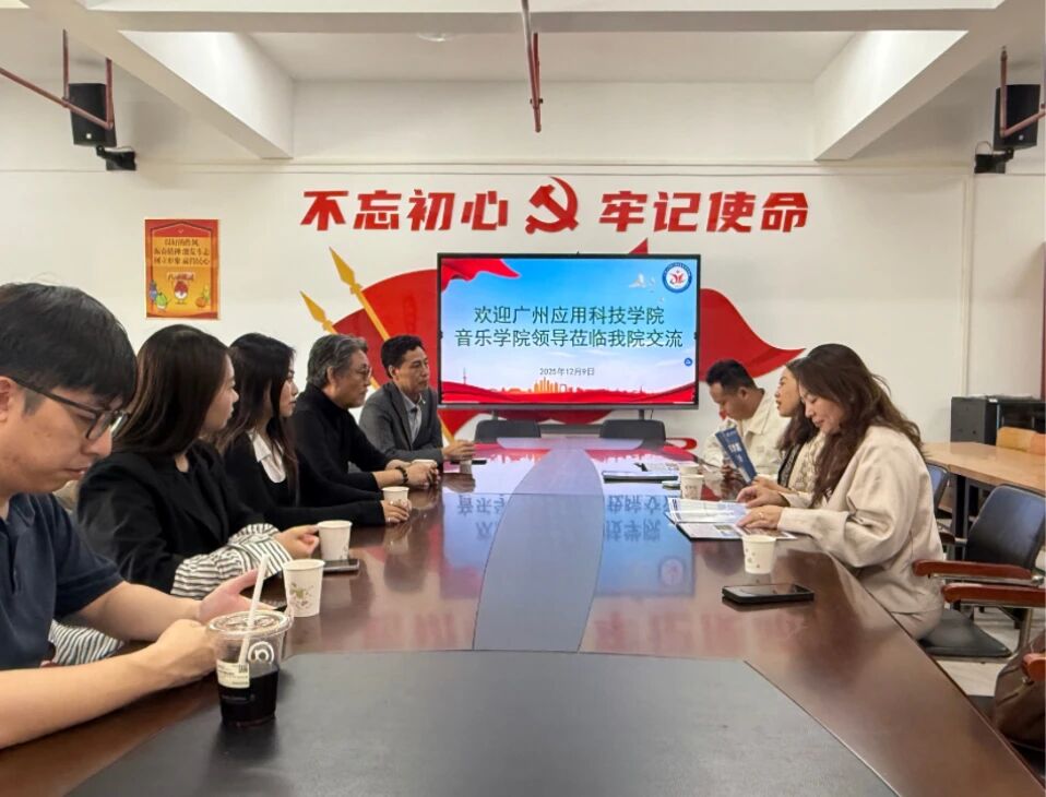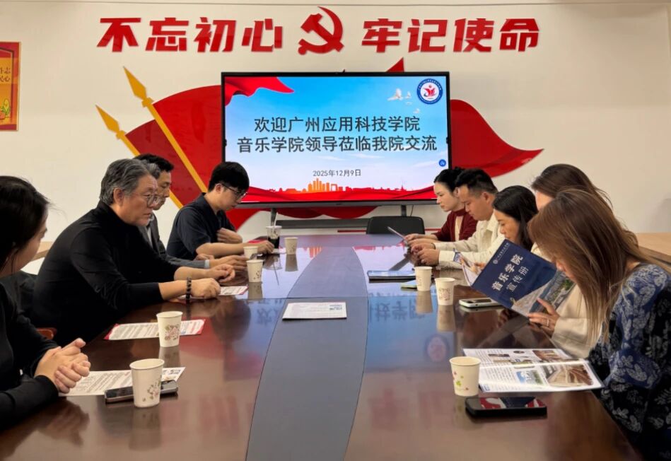 2025年12月9日下午14:00,广州应用科技学院音乐学院院长杨天君、副院长于贵祥、音乐专任教师肖敏、黄俊凯、冯烨一行前往江门幼儿师范高等专科学校艺术教育学院,围绕专升本人才培养、专业建设、招生合作等核心议题展开深度交流座谈,并开展教学实践交流活动。江门幼儿师范高等专科学校艺术教育学院党委书记郭永青教授、院长周玉娥教授、副院长汪薇、器乐教研室主任雷励副教授、声乐教师王海文、阳一晨共同参与本次研讨。