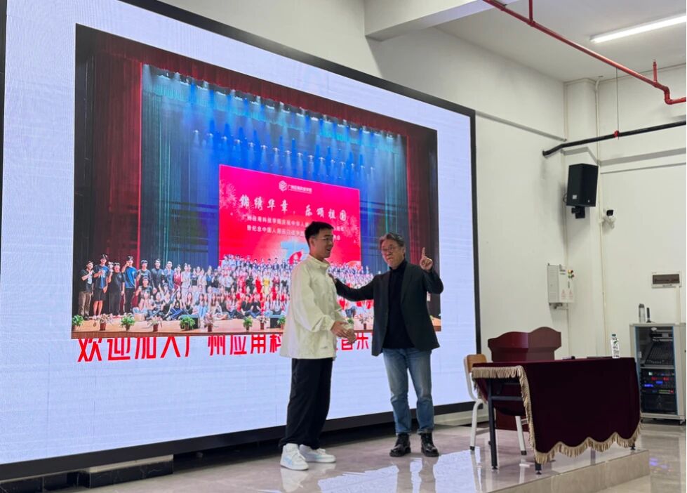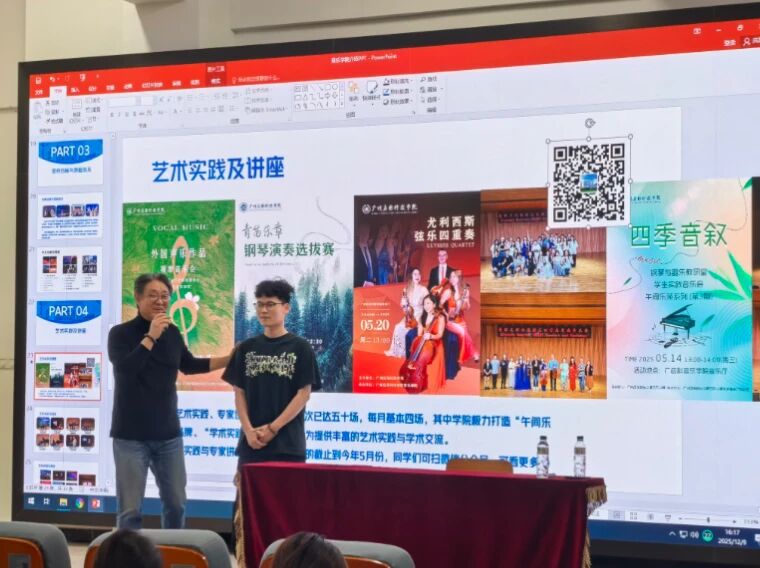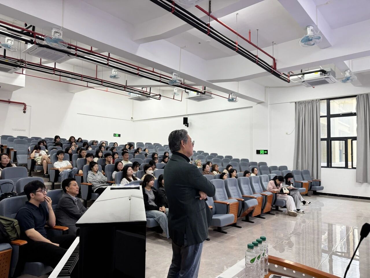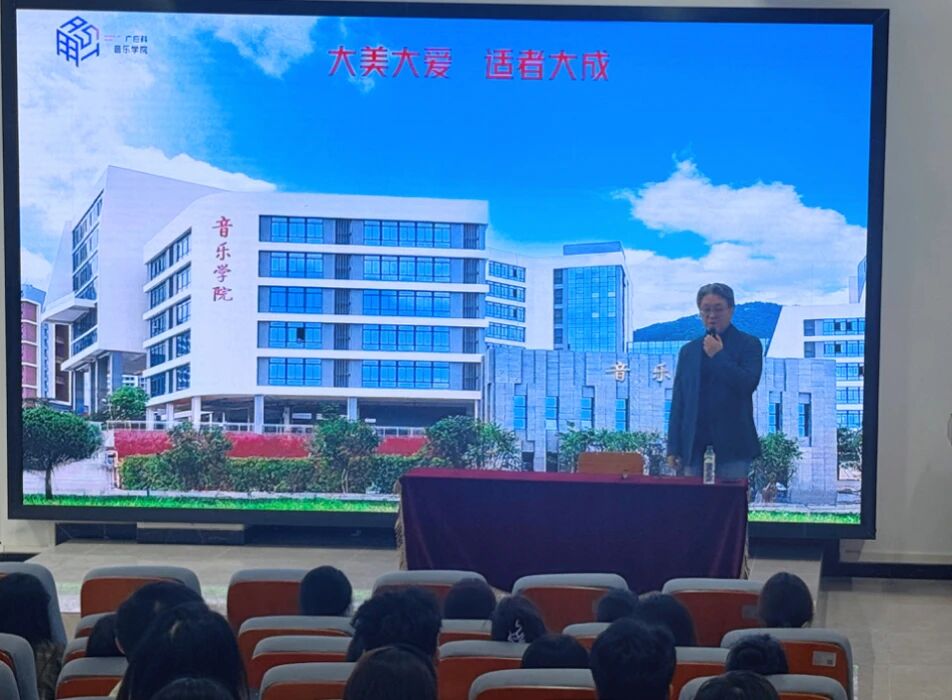 随后,教学座谈会上,杨天君院长向现场师生系统介绍了广州应用科技学院音乐学院的发展概况:师资方面,学院汇聚了许新华教授、周奇迅教授等行业骨干及博士教授等高层次人才,构建了专业搭配合理、实力雄厚的教学团队;培养目标方面,聚焦应用型艺术人才,既夯实音乐专业核心能力,又注重艺术管理、文艺活动策划等实践技能培育;课程设置方面,涵盖音乐理论、专业技能、实践应用三大核心模块,同步开设和声与即兴弹唱融合课程、音乐疗愈等特色课程;艺术实践方面,学院定期组织多样化演出、比赛及校际交流活动,邀请行业专家开展专题讲座,为学生搭建全方位成长。