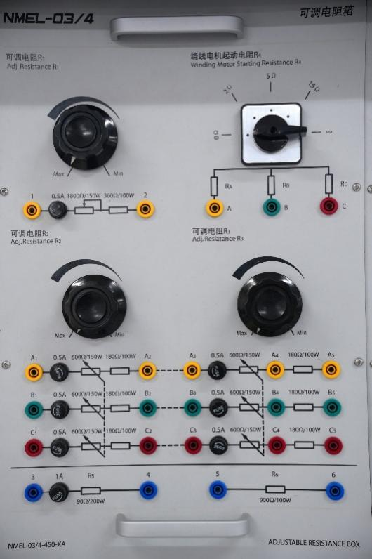 其中,可调电阻箱是实验台核心负载与参数调节部件,主要包含单相可调电阻、三相可调电阻和固定电阻,可通过旋钮调节阻值,适配直流发电机、变压器、异步电机等多种实验场景,既能作为负载实现不同工况下的特性测试,又能为绕线电机起动提供分级电阻以限制起动电流,还可通过串并联组合调整电路阻抗与电流参数,满足各类实验的条件设定需求。
