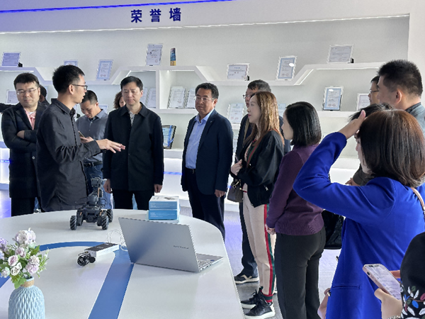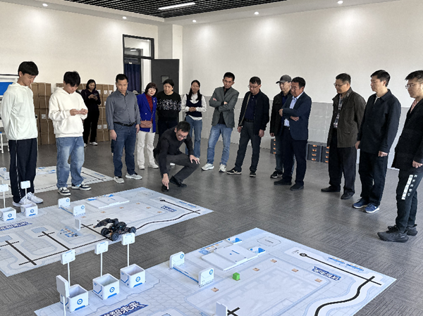 考察团一行先后参观了产业学院的机器人、实验室及赛事成果展示区。在赛事成果展示区,考察团重点查看了学院学子在各类机器人竞赛中的获奖作品与荣誉证书。学院副院长廖干洲详细汇报了近年来在机器人领域赛事的突破进展,特别是学子们在2025中国机器人大赛暨Robocup机器人世界杯中国赛顶级赛事中冲破重围,获得冠军,取得了重大成绩,充分展现了学院在智能感知与控制领域的科研积累与教学优势。