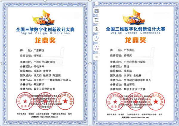 全国3D大赛作为极具影响力的全国性学科竞赛,本届赛事自2025年3月启动以来,吸引了全国31个省/直辖市/自治区/特别行政区的600余所院校参与。赛事历经校赛、初赛、网络海选等多轮选拔,竞争异常激烈。在此次广东省赛中,学院由成军浩老师、黄胜全教授联合指导的两支学生团队表现亮眼:钟文杰、张家琪、陈坚信团队与余卓冰、余松林团队,在“数字化工业设计大赛”赛道中双双摘得特等奖,打破了学院在该赛事特等奖奖项上的空白。