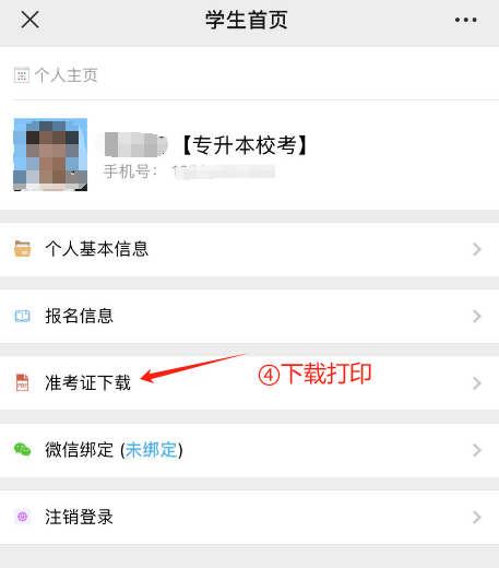 ④在个人页面选择“准考证下载”,请考生下载保存后自行打印。