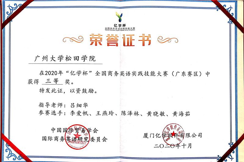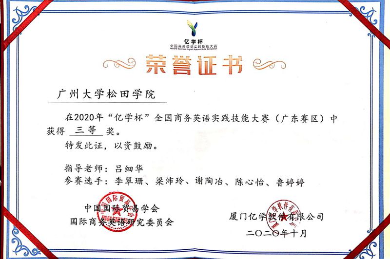 我校外语系2017级英语专业10位学生分为两组参加 2020年“亿学杯”全国商务英语实践技能大赛(广东赛区)比赛,荣获大赛(广东赛区)三等奖。