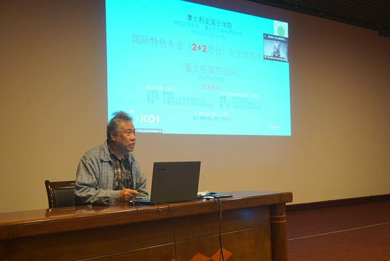 校长庞永师主持会议并介绍了国王学院及“2+2”双本学士联合培养项目的概况。在会上,“2+2”双本项目主讲人,澳大利亚国王学院副校长沈根生通过视频会议的方式详细地讲解了“2+2”双本项目的育才理念、项目特色人才培养模式、“2+2”双学士联合培养项目的十大优势、国王学院入学程序(2021年7月份)、项目服务流程等方面的详细内容,并介绍了“2+2”双学士联合培养项目的专业负责团队和国王学院与松田学院在“2+2”双本学士联合培养项目上的深度合作。
