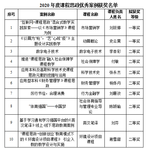 按照广东省本科高校文化素质教育指导委员会《关于征集课程思政教学优秀案例的通知》文件安排,我校开展了案例推荐遴选工作,并报送广东省本科高校文化素质教育指导委员会。近日,广东省本科高校文化素质教育指导委员会将2020年度课程思政优秀案例入选名单予以公示。我校共10个课程思政优秀案例获奖,其中一等奖2个,二等奖8个,具体获奖名单如下: