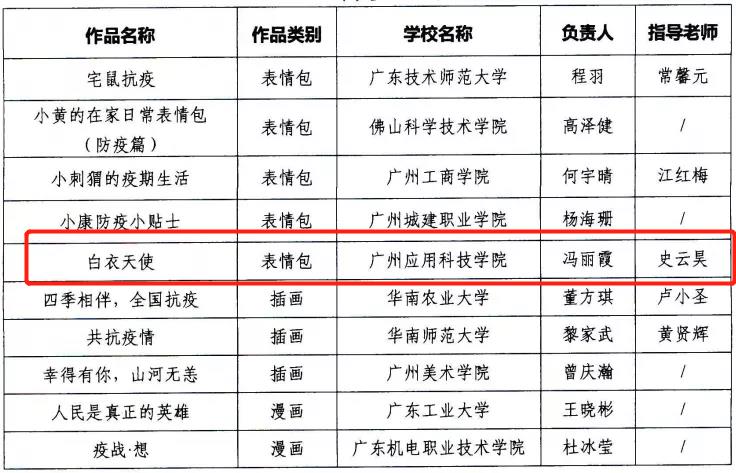 1月18日,广东省教育厅关于公布第五届广东高校网络媒体展示节主题原创作品征集活动结果的通知,我校艺术与传媒系17级动画专业学生冯丽霞(指导老师:史云昊)的作品《白衣天使》,获得“画”类作品全省一等奖。这是我校成功转设为广州应用科技学院之后,收获的第一个师生参赛奖项。
