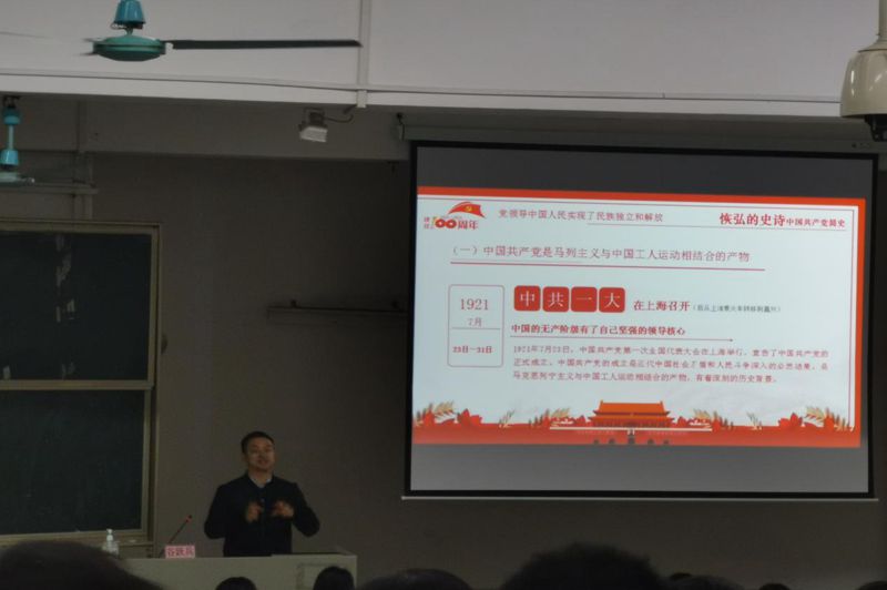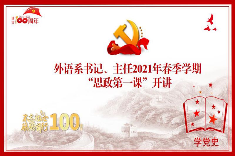 在中国共产党建党100周年倒计时100天之际,3月23日下午,为深入学习领会习近平总书记在党史学习教育动员大会上的重要讲话精神,庆祝中国共产党成立100周年,落实学校印发的《关于做好我校2021年春季学期院(系)党组织书记、院长(系主任)上第一堂思想政治理论课的通知》,外语系书记、主任2021年春季学期“思政第一课”在教学楼四栋阶梯3和阶梯4同步开讲,为2019级和2020级同学讲授了一堂生动精彩的党史“思政第一课”。