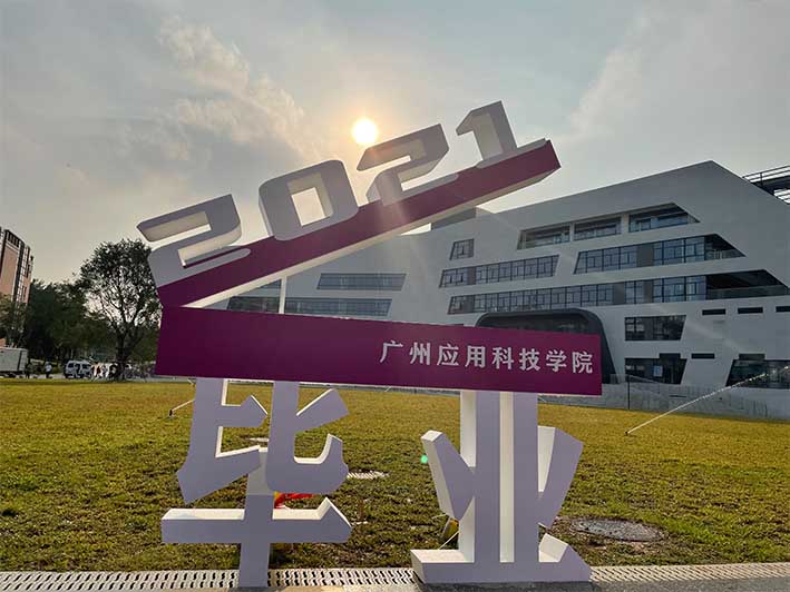 新图书馆广场对于很多应届毕业生来说,都相对较为陌生,因为在大四离校实习前,该处建筑物还未全部完工。为了让应届毕业生也能感受大学期间学校全新的建筑风貌,学校在广场东侧,设计制作了一个电影开拍造型的浮雕,上方为“2021”字样,中间为学校转设后的新校名“广州应用科技学院”,下方以“毕业”二字支撑。