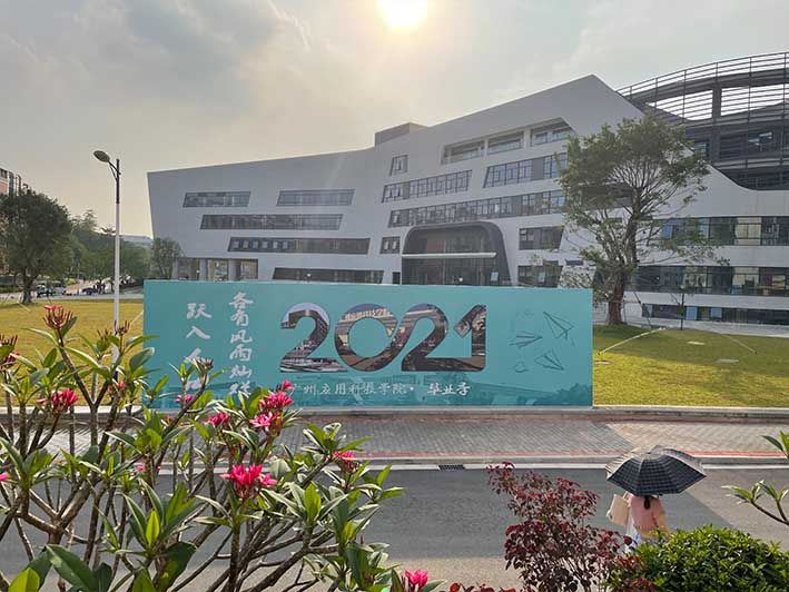 2021年,我校成功转设更名后迎来的首个毕业季,学校专门在新图书馆广场,设置了浮雕和背景墙等2组毕业留影区。尤其是留影墙的设计概念,学校新闻中心对将学校的广州校区、肇庆校区相关元素理念,第一次在毕业季作了融合。
