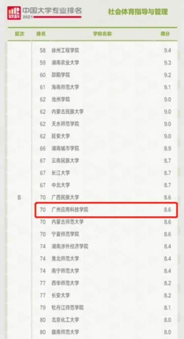6月22日,高等教育评价专业机构软科正式发布2021“软科中国大学专业排名”。我校社会体育指导与管理专业上榜,排名全国第70位,位列全国民办本科高校(含独立学院)第1名。