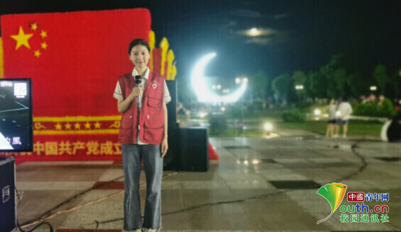图为实践团成员黄佳婷在乡村文化广场通过传唱红色歌曲普及党史。中国青年网通讯员黄佳婷摄