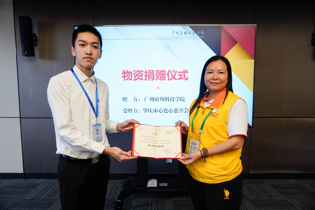 肇庆市心连心慈善机构副理事长兼秘书长黎俊炫代表心连心慈善机构,授予我校法政学院荣誉证书。