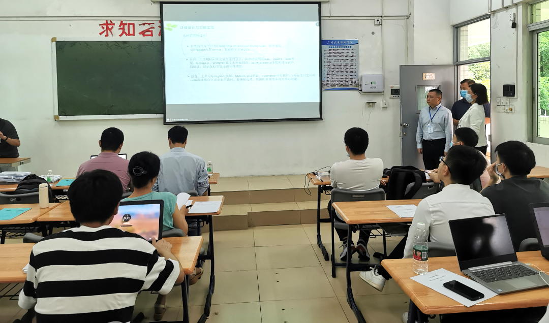 ▲学校董事长、校长刘剑锋(前排)在副校长刘志新(右二)等的陪同下,在广州校区现场督导聆听毕业生毕业答辩。