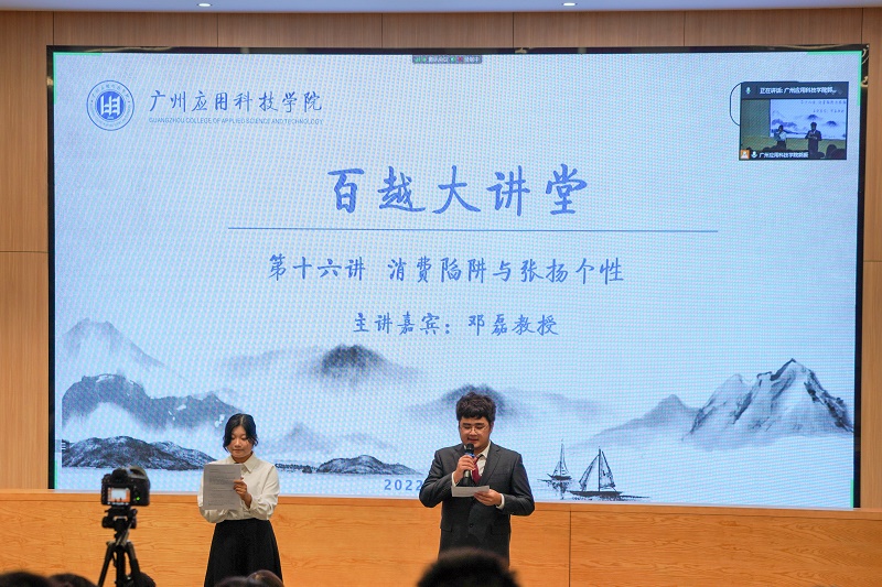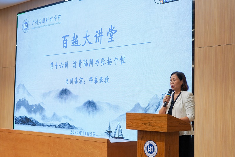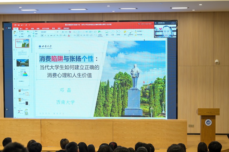 11月9日下午,我校“百越大讲堂”第十六讲在图书馆一楼报告厅开讲。西南大学博士生导师邓磊教授为我校师生带来了《消费陷阱与张扬个性:当代大学生如何建立正确的消费心理和人生价值》专题讲座。学校副校长刘志新、校团委书记郭振及300余名师生到场聆听讲座,讲座由刘志新副校长主持。