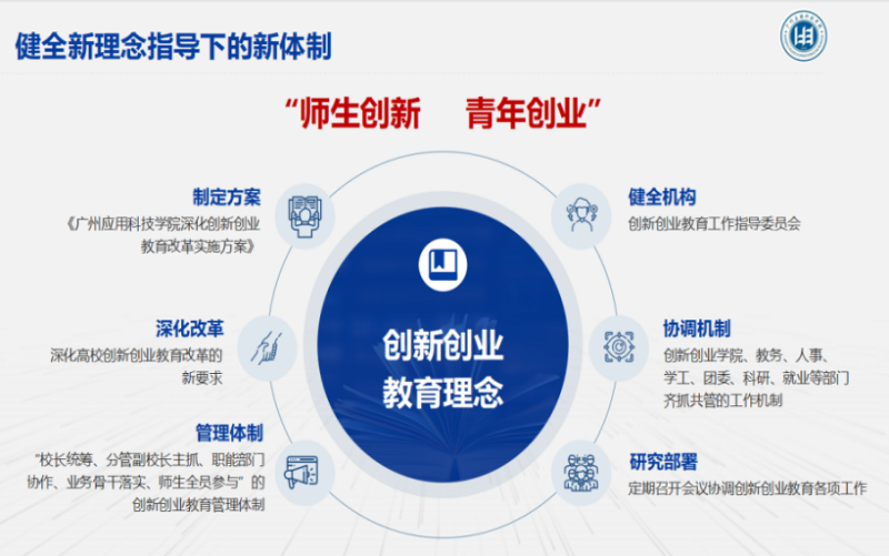 我校高度重视创新创业教育工作,深入贯彻落实《国务院办公厅关于深化高等学校创新创业教育改革的实施意见》、《广东省教育厅关于深化高校创新创业教育改革的若干意见》等文件精神,积极构建“大众创业,万众创新”新理念指导下的新体制,制定《广州应用科技学院深化创新创业教育改革实施方案》;深化高校创新创业教育改革的新要求,成立以“校长统筹、分管副校长主抓、职能部门协作、业务骨干落实、师生全员参与”的创新创业教育管理体制,健全创新创业教育工作指导委员会、协调创新创业学院、教务、人事、学工、团委、科研、就业等部门齐抓共管的工作机制;制定了创业课程建设、创业导师管理办法、创新创业奖学金管理办法等12方面的创新创业规章制度,形成领导有力、齐抓共管的创新创业教育工作全校“一盘棋”局面,定期召开会议协调创新创业教育各项工作。