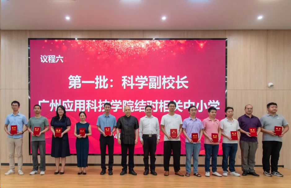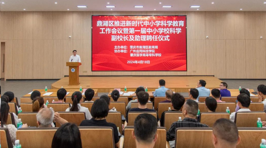 为深入学习贯彻习近平总书记在党的二十大报告中强调“必须坚持科技是第一生产力、人才是第一资源、创新是第一动力”的重要讲话精神,致力于在科学教育中做好加法,全面推进素质教育,积极推动中小学科学教育学校主阵地与社会大课堂有机衔接,提高学生科学素质,厚植科学家潜质和建设科学强国的家国情怀,4月18日上午,由肇庆市鼎湖区教育局主办,广州应用科技学院、肇庆医学高等专科学校协办的肇庆市鼎湖区推进新时代中小学科学教育工作会议暨第一届中小学校科学副校长及助理聘任仪式,在我校图书馆一楼报告厅举行。
