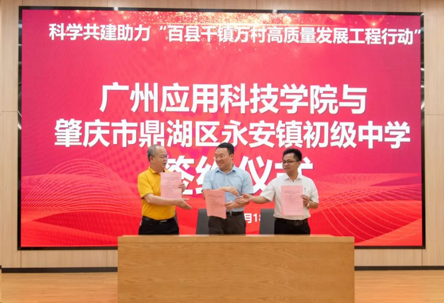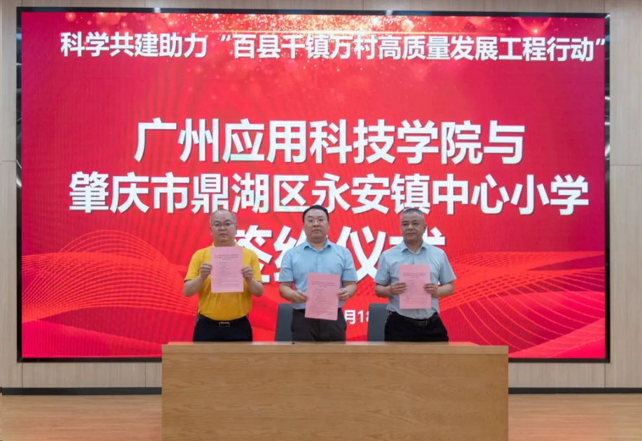 创新创业学院院长、科研处处长荀海鹏代表学校与肇庆市鼎湖区吴大猷学校、肇庆市鼎湖区沙浦初级中学、肇庆市鼎湖区永安初级中学、肇庆市鼎湖区莲花初级中学、肇庆市鼎湖区沙浦中心小学、肇庆市鼎湖区永安中心小学、肇庆市鼎湖区永安新村小学、肇庆市鼎湖区莲花真光中心小学、肇庆市鼎湖区莲花莲塘小学、肇庆新区华侨城小学、鼎湖中学(初中部)共11所中小学签订《新时代中小学科学教育协议书》。
