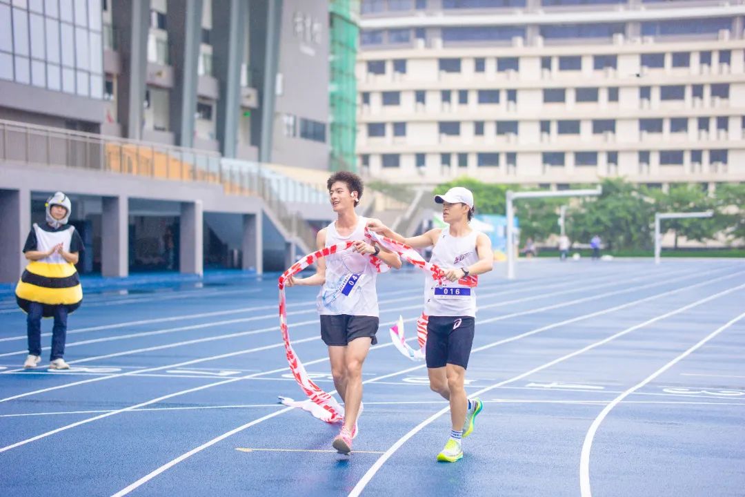 赛事中,无数精彩瞬间被镜头定格。在长达数公里的赛道上,来自体育科技学院运动康复专业的李帅辉、法政学院法学专业的许俊纲两位选手在赛道上是竞争对手,在冲刺第一名跨线的最后关头,他们选择了成为并肩作战的伙伴,代表友谊的双手紧紧相握,最终并肩跨过了终点线,为广应科首次校园马拉松历史上留下并肩同行的佳话记忆。来自外国语学院英语专业的参赛选手张文燕,是一位资深的长跑爱好者,在此次“奔跑青春·迷你马拉松”中选择赤脚跑完全程5公里的校园马拉松比赛。面对着包括柏油路、石板路以及草地等复杂的赛道环境,她的步伐始终稳健而自信。她表示:“赤脚奔跑能让人更加亲近大自然,感受地面的质感,这种体验与穿鞋奔跑截然不同,带来更加纯粹的运动感受。”