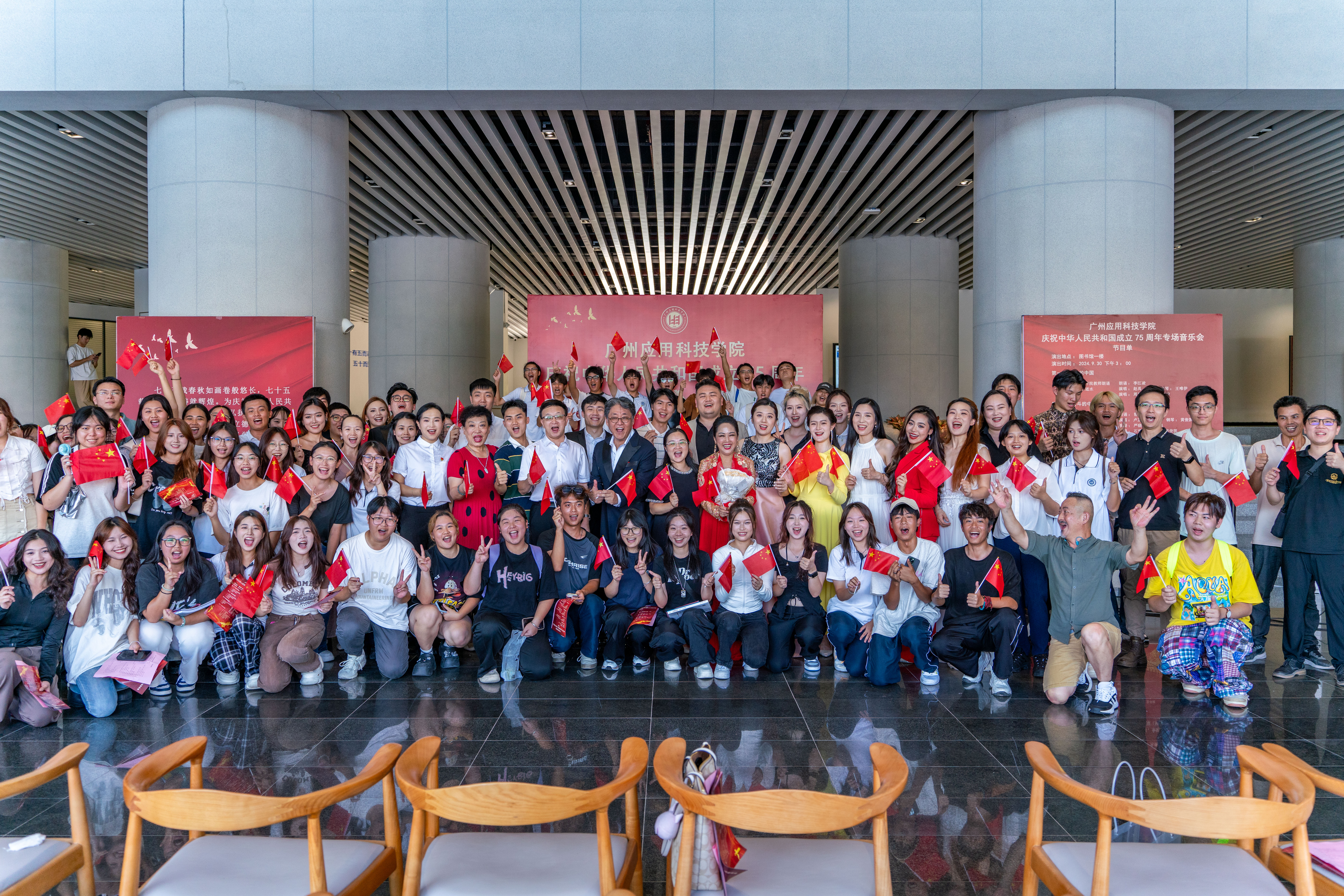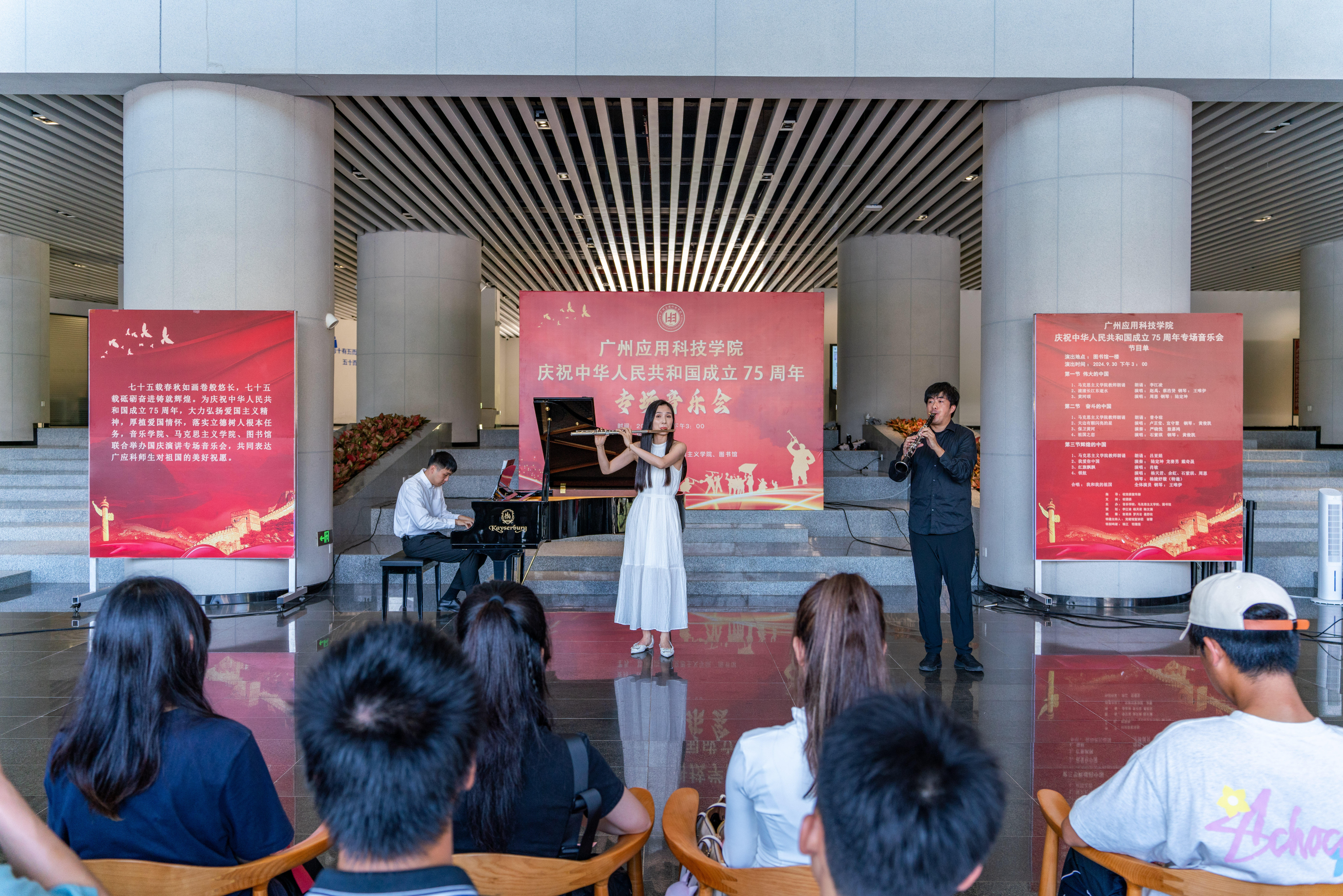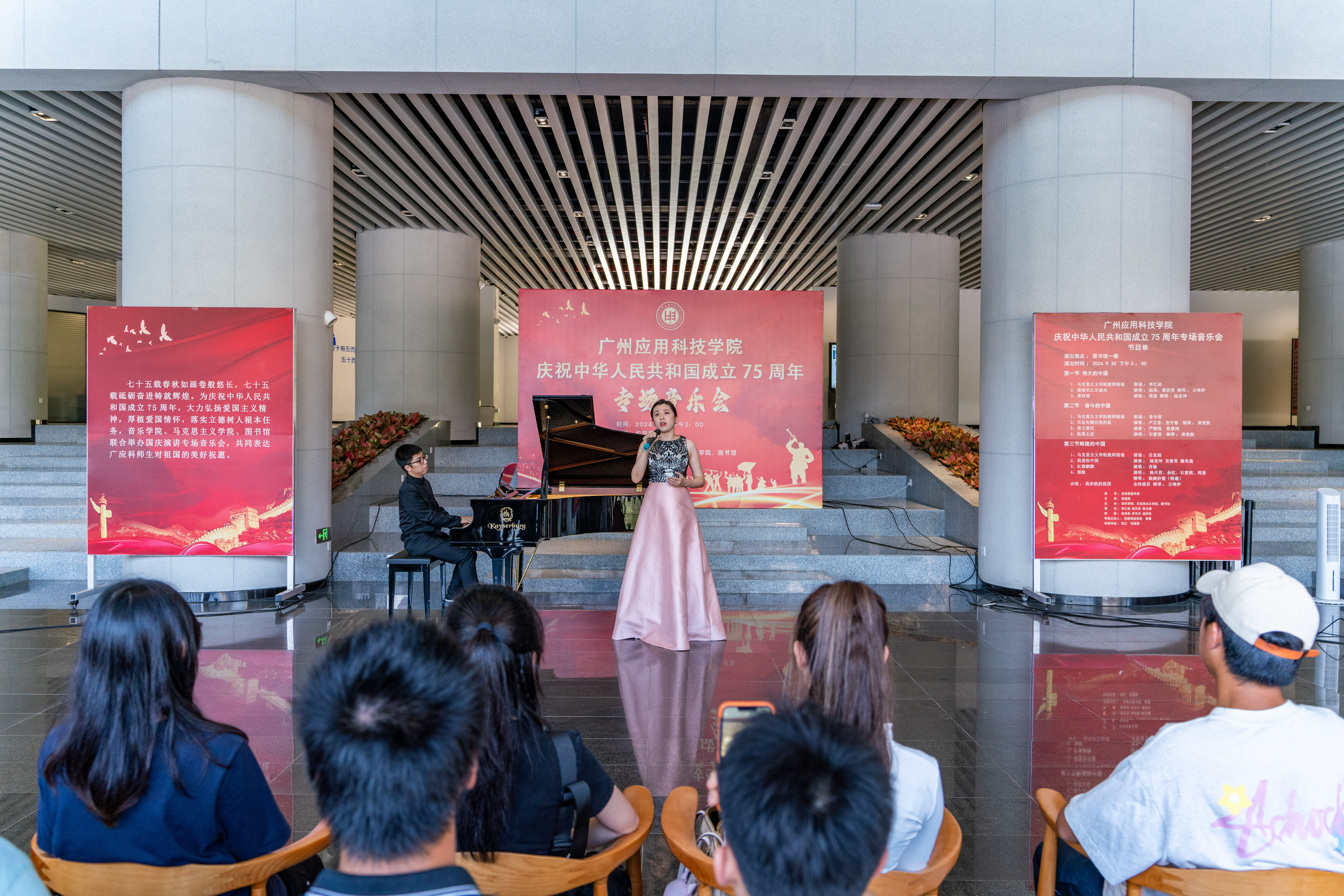 在金秋送爽、举国同庆的美好时节,广州应用科技学院洋溢着一股浓厚的节日氛围。为庆祝中华人民共和国成立75周年,9月30日下午,学校举办国庆专场音乐会,以音乐为媒介,向祖国献上最诚挚的祝福。