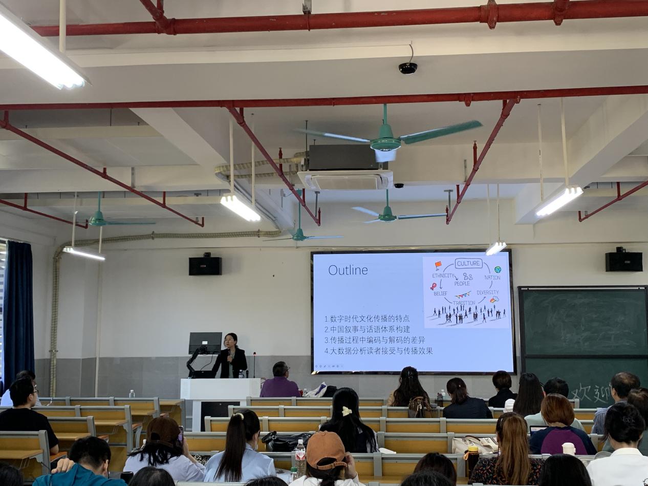 讲座中,崔艳秋教授首先介绍了数字时代文化特点,提出了多个研究课题与理论和在场的教师们探讨。崔教授强调,在数字时代进行文化传播,尤为重要的是如何构建属于我们自己的话语体系,在运用中国叙事的特点进行文化的传播。