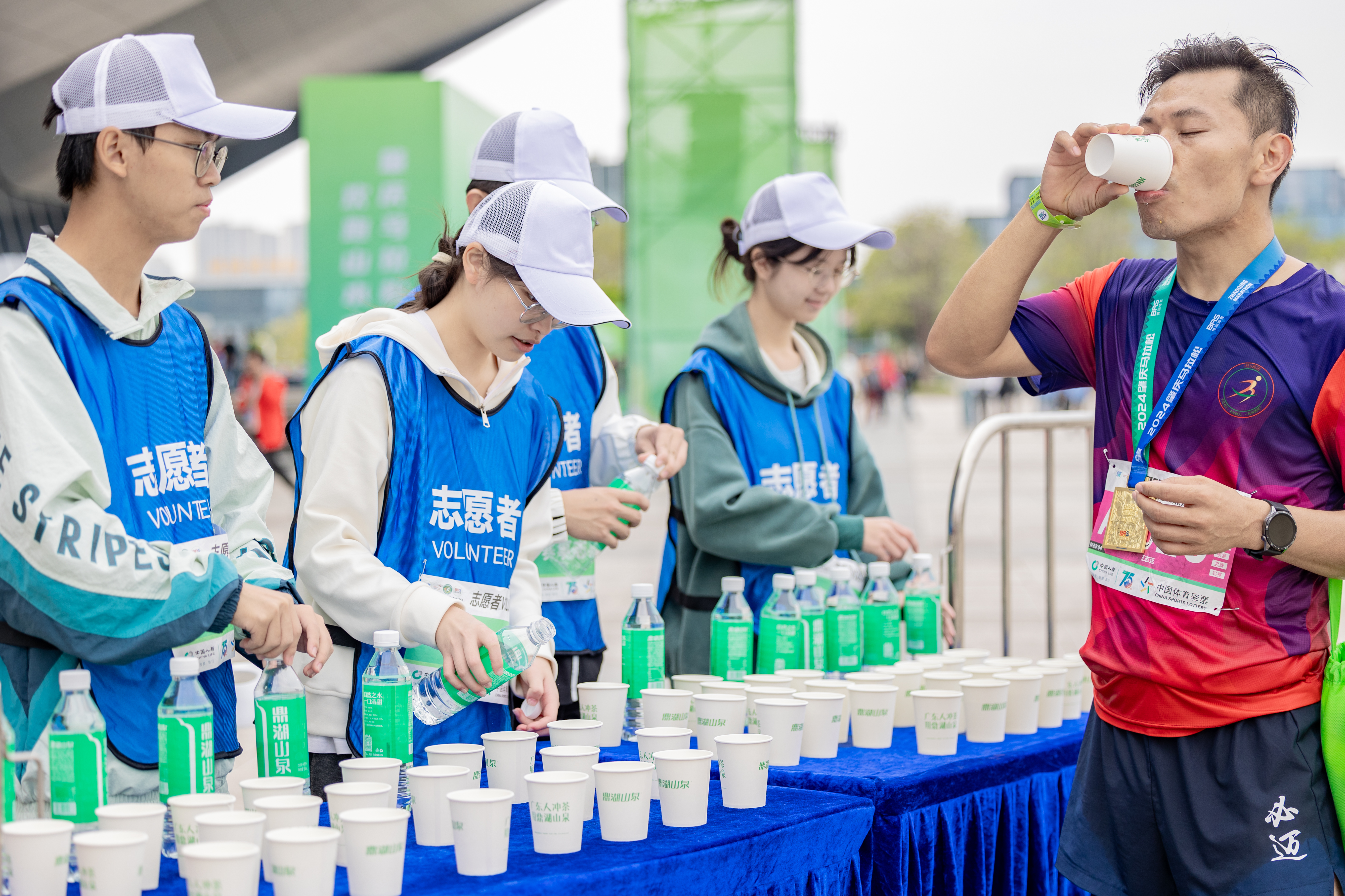 一动一静,“肇马”特色的风景图!9时30分,志愿者们在终点处始终保持高昂的热情,高呼“肇庆马拉松,欢跑山水中”,体现了“奉献、友爱、互助、进步”的志愿精神。随着运动员们逐渐接近终点,赛场气氛愈加热烈。在粤港澳大湾区西部商务中心这一地标,志愿者们不断为运动员加油鼓劲,提供水、能量饮料、毛巾等补给,并由体育科技学院学生志愿者提供专业赛后肌肉拉伸服务,助力运动员快速恢复。