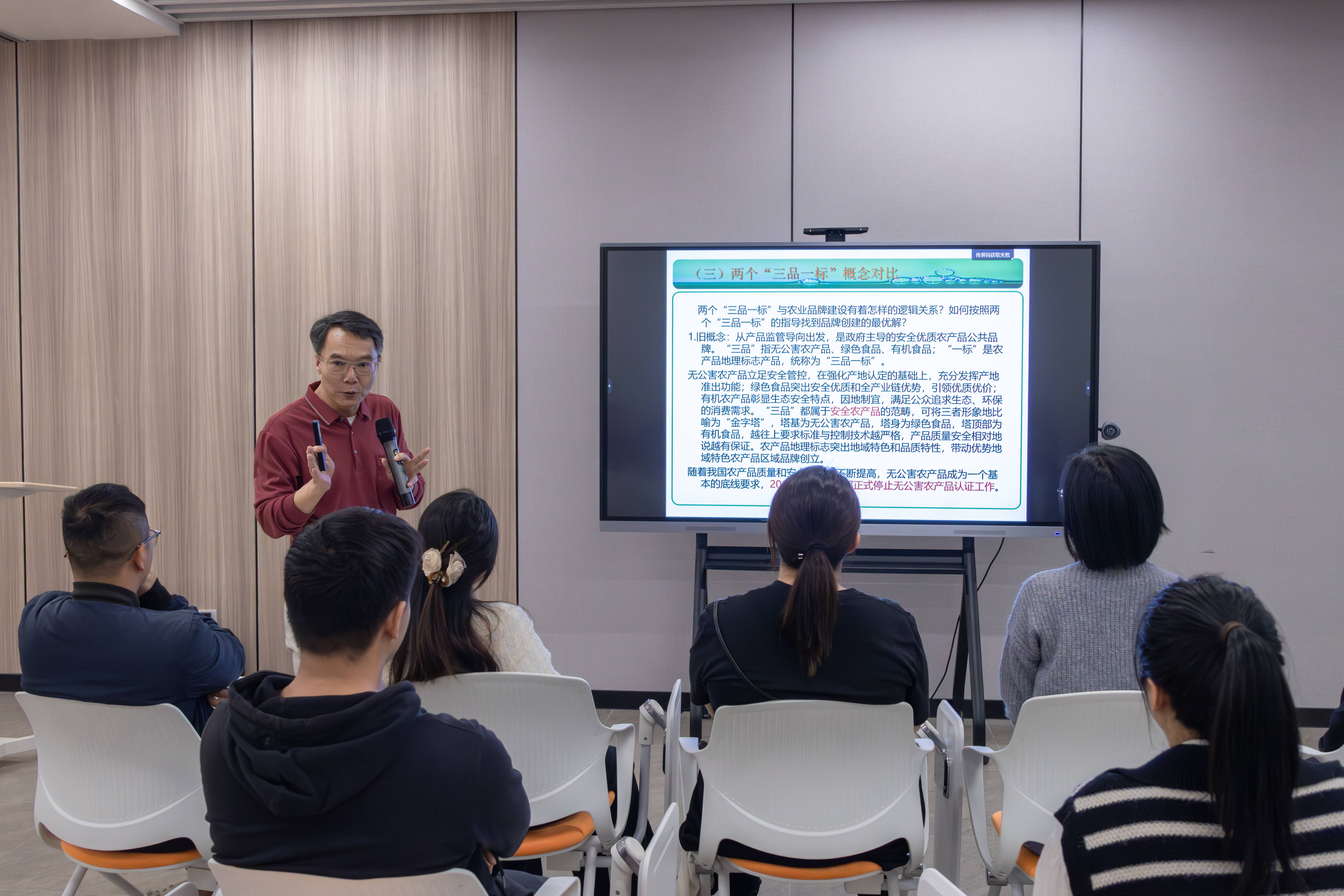 广州应用科技学院“百千万工程”工作专班主任兼乡村产业学院院长龙镇辉作“农业新‘三品一标’与鼎湖农产品供应链创新”专题授课。龙镇辉院长主要从"三品一标"的概念对比、"三品一标"的特点分析、"三品一标"的目标以及农产品供应链创新四个方面向鼎湖区现代农业产业链工作委员们展开授课。他表示,"三品一标"的目标应该是重源头良种先行、重质量关注产品品质提升、重品牌提升产品市场竞争能力、重标准强化生产标准体系建设,最终实现农产品质量和安全水平提高,从而增强农业的市场竞争力,实现农业现代化。在龙镇辉院长的授课过程中,参会者积极发表自己的观点和疑问,讨论氛围活跃且井然有序。随着授课的深入,鼎湖区现代农业产业链工作委员们对"三品一标"有了更全面的认识。此次授课为鼎湖区农业的未来发展提供了思路,有助于将“三品一标”的理念与实际工作紧密结合,推动农业产业链的壮大,加速鼎湖区农业现代化的步伐。