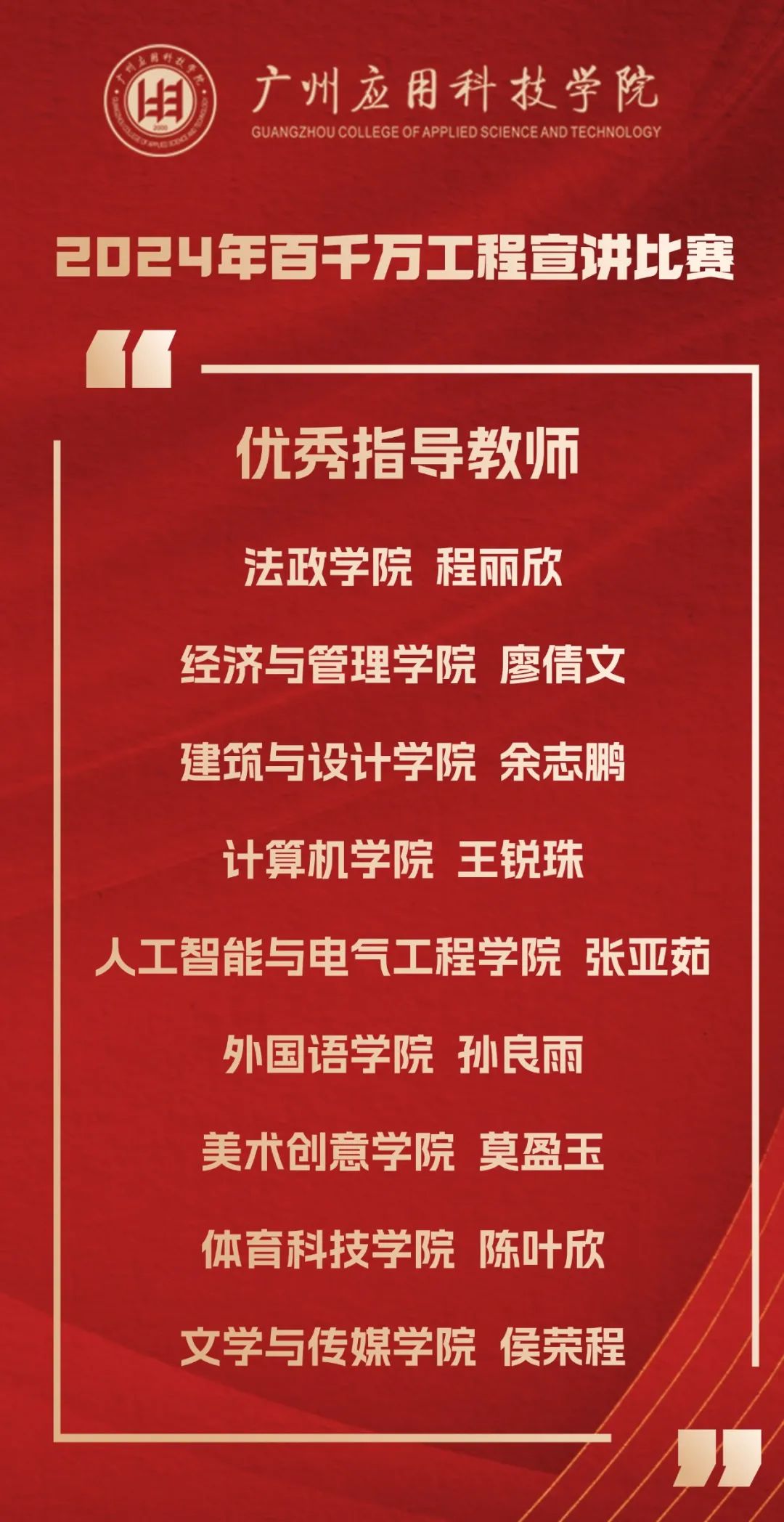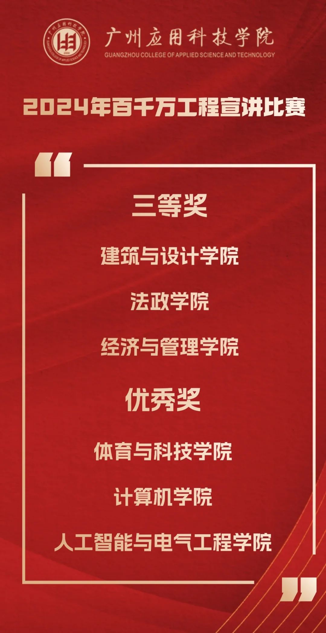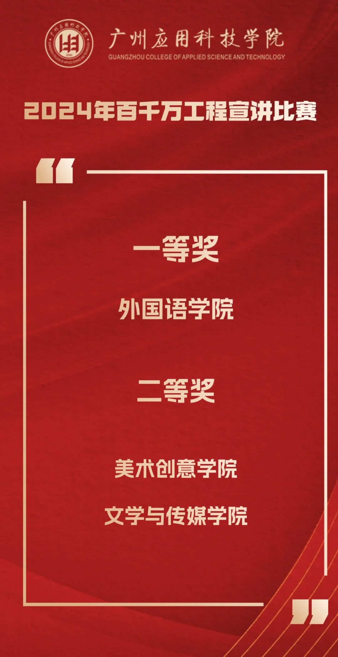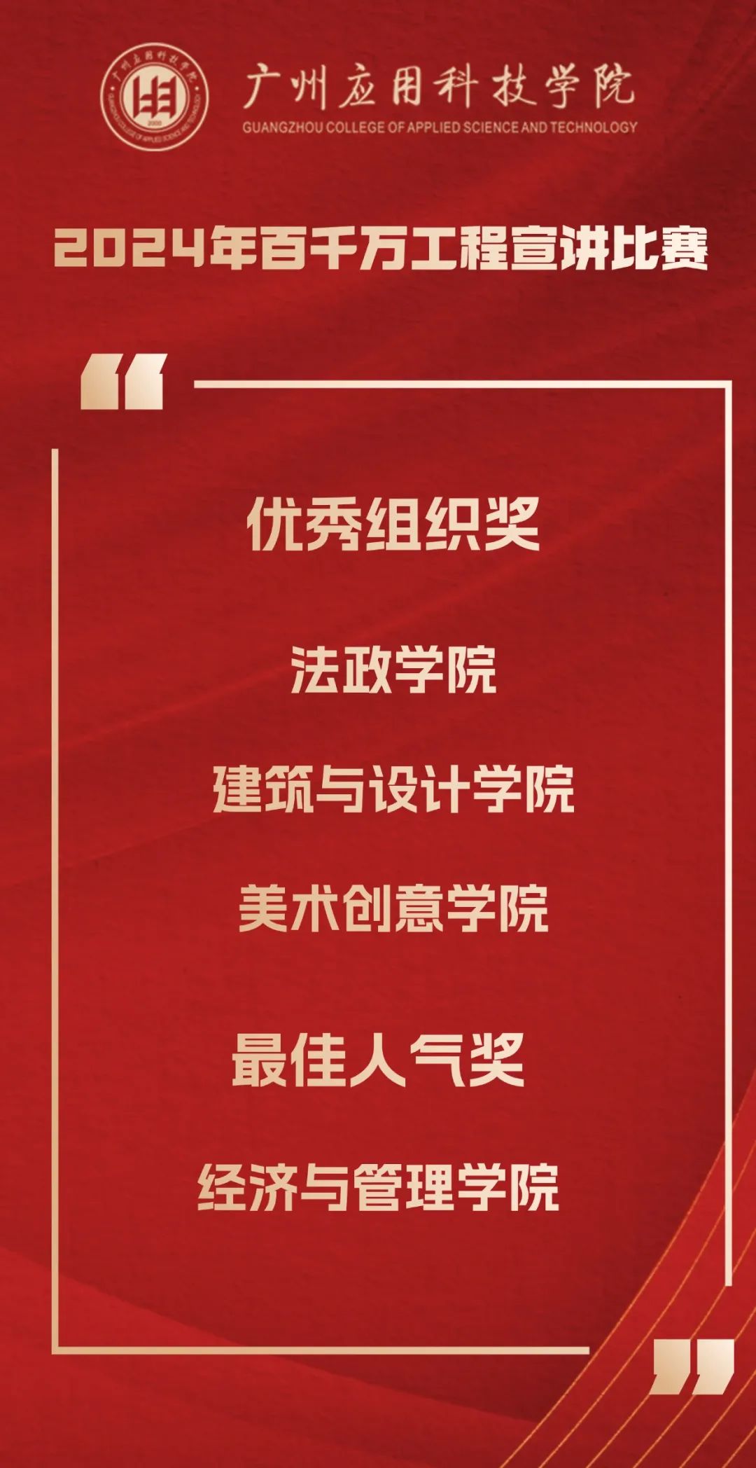 今年是“百千万工程”加力提速推进、实现全面突破的关键之年。广州应用科技学院从年初开始,做好顶层设计,制定目标任务,出台系列政策,完善考核评价,做优典型选树。学校党政领导以上率下,多次带队深入基层调研推进“百千万工程”,全校上下掀起实干争先、百舸争流的热潮。学校党委宣传部牵头主办2024年“百千万工程”宣讲活动,得到了各相关职能部门、各二级学院的大力支持。