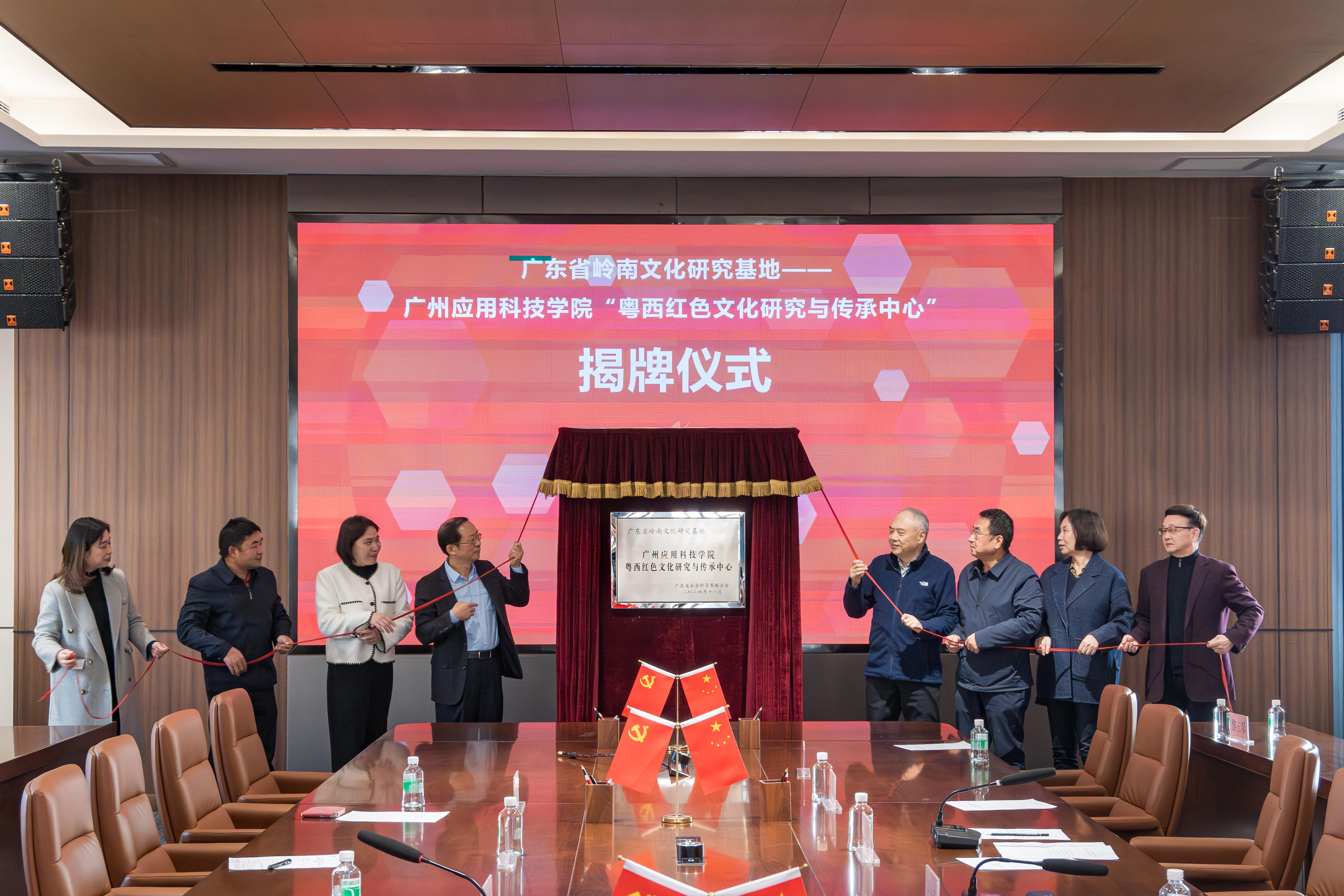 在热烈的掌声中,广东省社会科学界联合会一级调研员游华潮,市委宣传部市委讲师团副团长汤婉文,肇庆市社会科学界联合会党组成员、专职副主席徐美龙,广州应用科技学院执行校长张光宇、广州应用科技学院党委书记陈光团,广州应用科技学院党委副书记刘志新,广州应用科技学院马克思主义学院院长李江凌,共同为广东省岭南文化研究基地——广州应用科技学院“粤西红色文化研究与传承中心”揭牌。