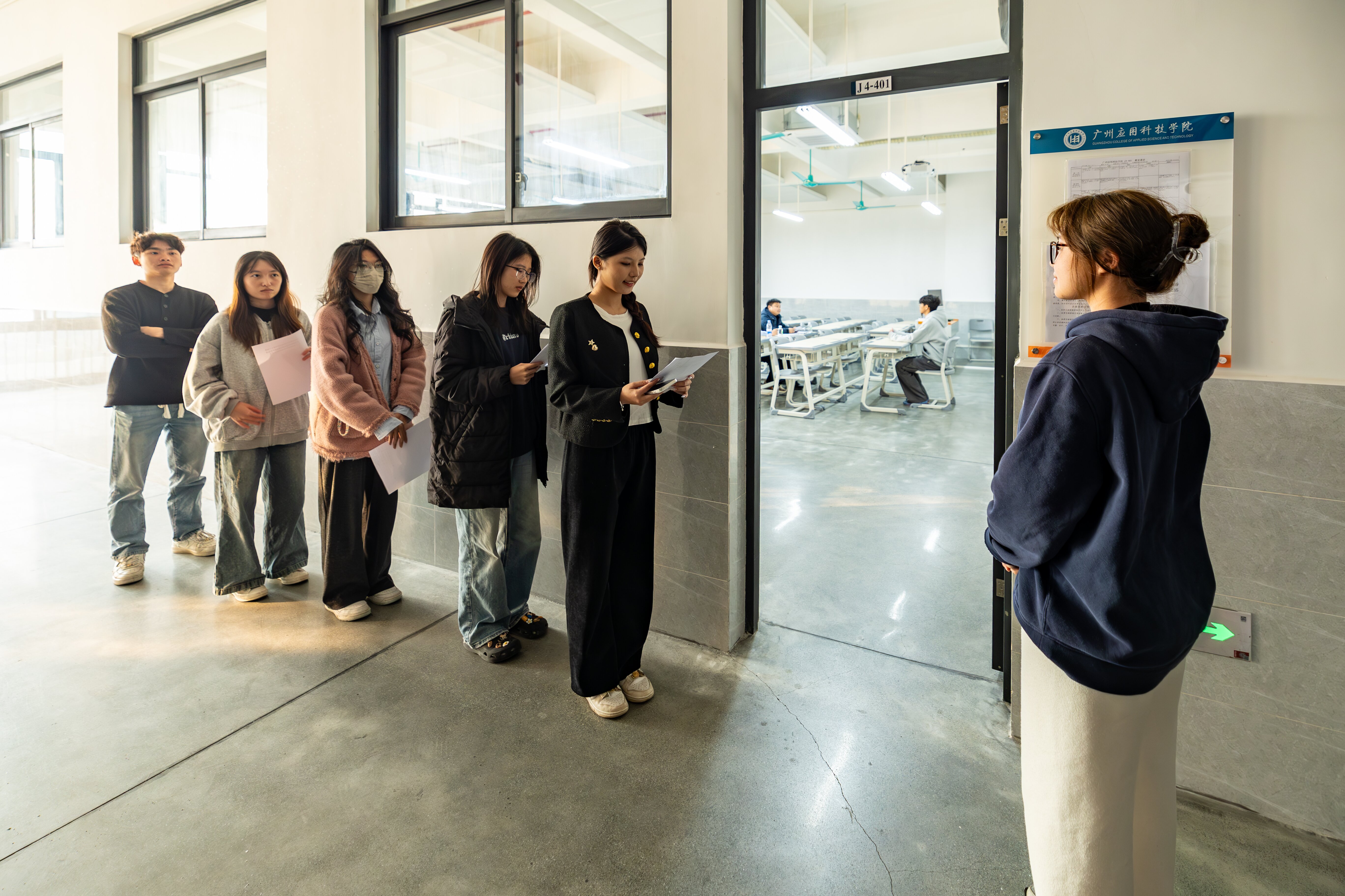1月7日和1月8日,我校团委分别在J3教学楼和J4教学楼组织赛会志愿者选拔面试工作。两处教学楼设考场与候考室各7间,确保了面试流程的高效与有序。此次面试覆盖了来自10个二级学院的通过笔试的学生,共594名通过笔试的学生积极参与,广应科赛会志愿者计划最终将录用396人。