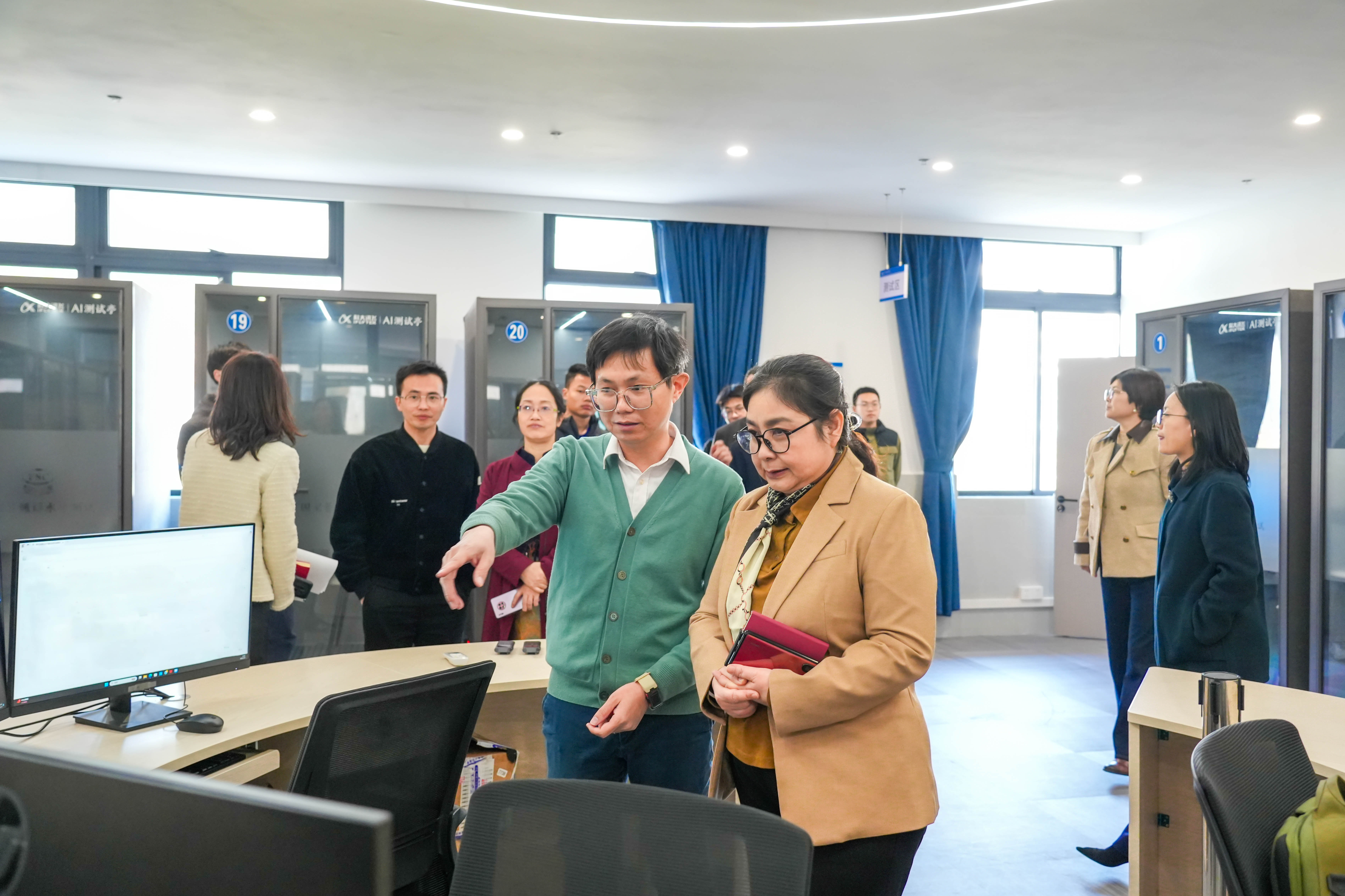 1月9日,省语委办的专家组一行实地查看了我校的普通话测试场所,现场观摩了模拟从报名到测试的整个流程,并演示了先进的语音识别技术和自动化评分系统。专家组高度肯定了我校普通话测试工作,充分认可了学校普通话水平测试软硬件环境建设的水平,并就普通话测试站的具体运行工作提出意见和建议。