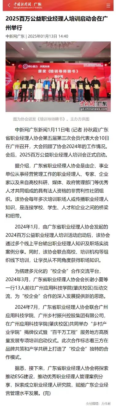 1月11日,中国新闻网刊发消息《2025百万公益职业经理人培训启动会在广州举行》,报道广东省职业经理人协会第五届第三次会员代表大会1月10日在广州召开,文章重点回顾了广东省职业经理人协会联合广州应用科技学院开展全方位合作,在品牌共策和产学共研上打造了“校企会”独特的合作模式。