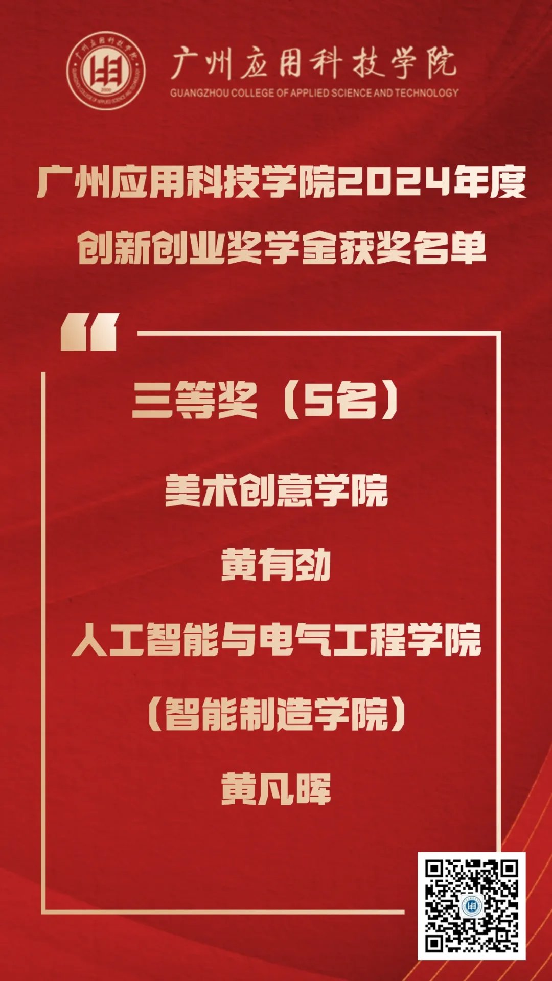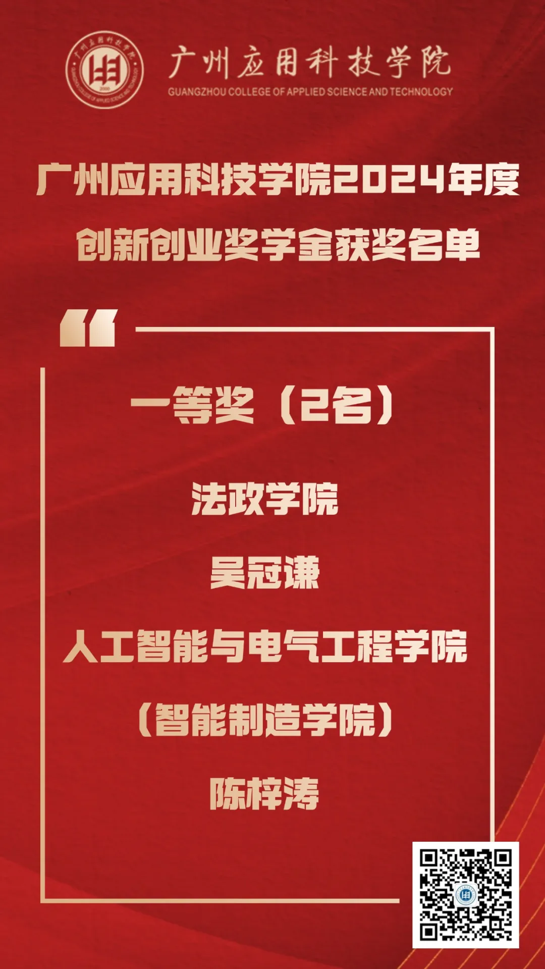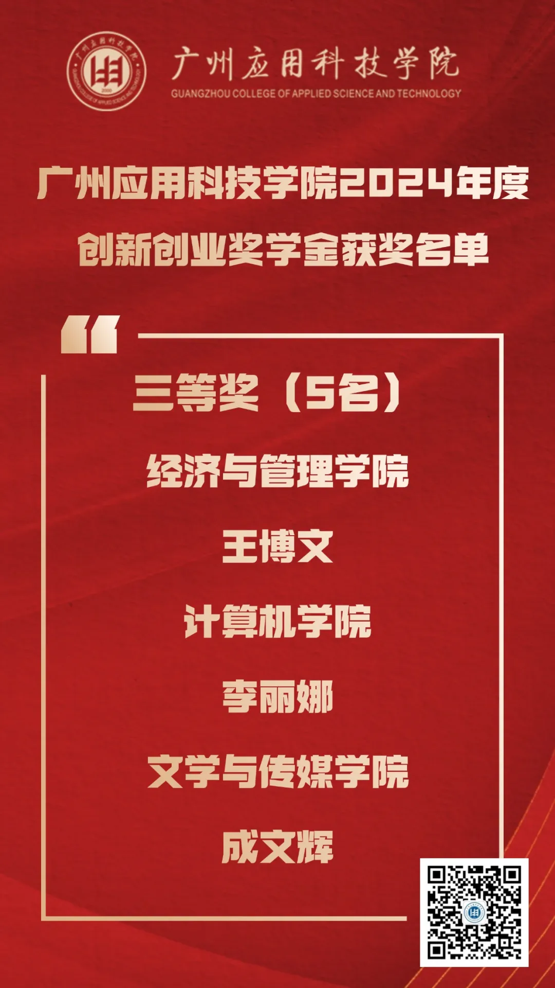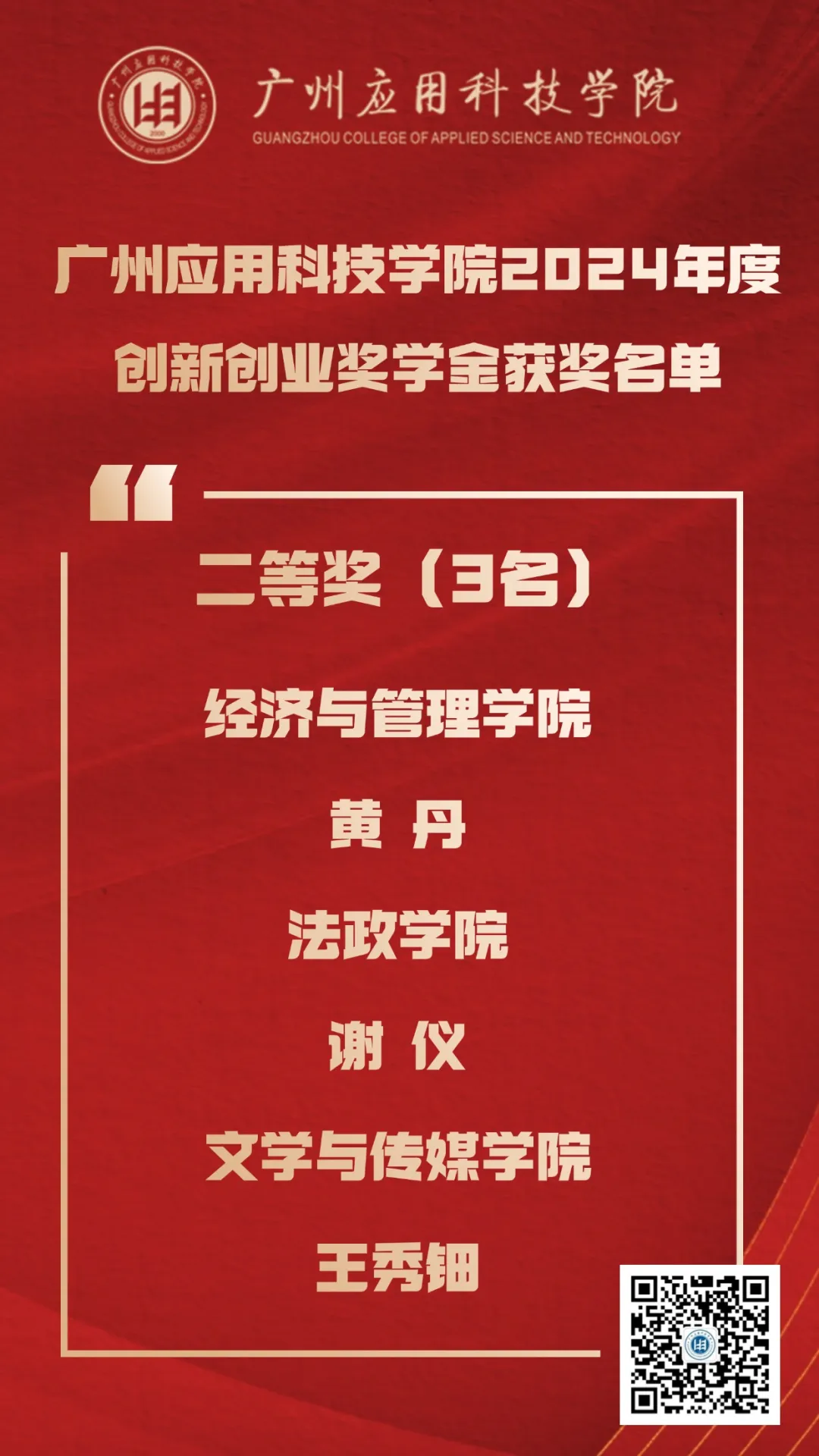 创新,已成为推动社会进步和经济发展的关键动力。广州应用科技学院,作为一所致力于培养高素质应用型人才的高等学府,始终将创新创业教育视为核心使命之一。近日,学校正式发布了《广州应用科技学院关于表彰2024年度创新创业奖学金获奖个人的决定》,吴冠谦等10名同学凭借其出色的创意、扎实的项目执行能力和显著的社会效益,从众多参与者中脱颖而出,荣获广州应用科技学院2024年度创新创业奖学金。