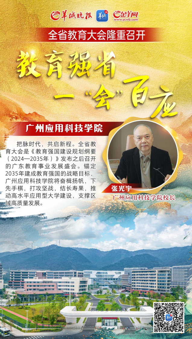 “锚定2035年建成教育强国的战略目标,我们将奋楫扬帆,下先手棋,打攻坚战,结长寿果,推动高水平应用型大学建设,支撑区域高质量发展。”广州应用科技学院校长张光宇表示。