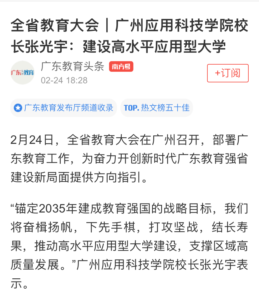 乘势而上开新局,砥砺奋进启新篇。全省教育大会结束后,广州应用科技学院校长张光宇接受省委党报《南方日报》、羊城晚报等主流媒体专访,他结合本次会议精神,从学校高质量发展的角度出发,回答“广应科方案”:“下先手棋,打攻坚战,结长寿果,推动高水平应用型大学建设,支撑区域高质量发展。”