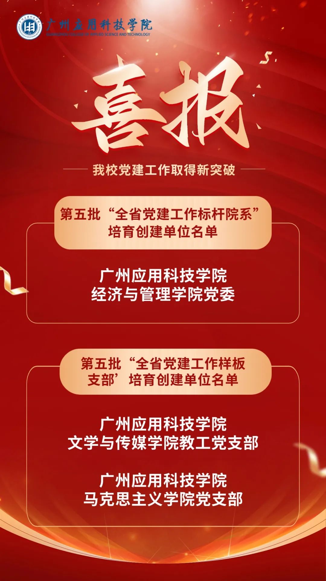 近日,中共广东省委教育工委公布了第五批全省党建工作示范高校、标杆院系、样板支部培育创建单位名单,我校经济与管理学院党委入选全省党建工作“标杆院系”培育创建单位,文学与传媒学院教工党支部、马克思主义学院党支部双双入选全省党建工作 “样板支部”培育创建单位。这是继2023年我校3个支部入选第四批“全省党建工作样板支部”,2024年1个支部入选第四批“全国党建工作样板支部”、入选全国高校“双带头人”教师党支部书记“强国行”专项行动团队后,我校党建工作取得的新的标志性突破。