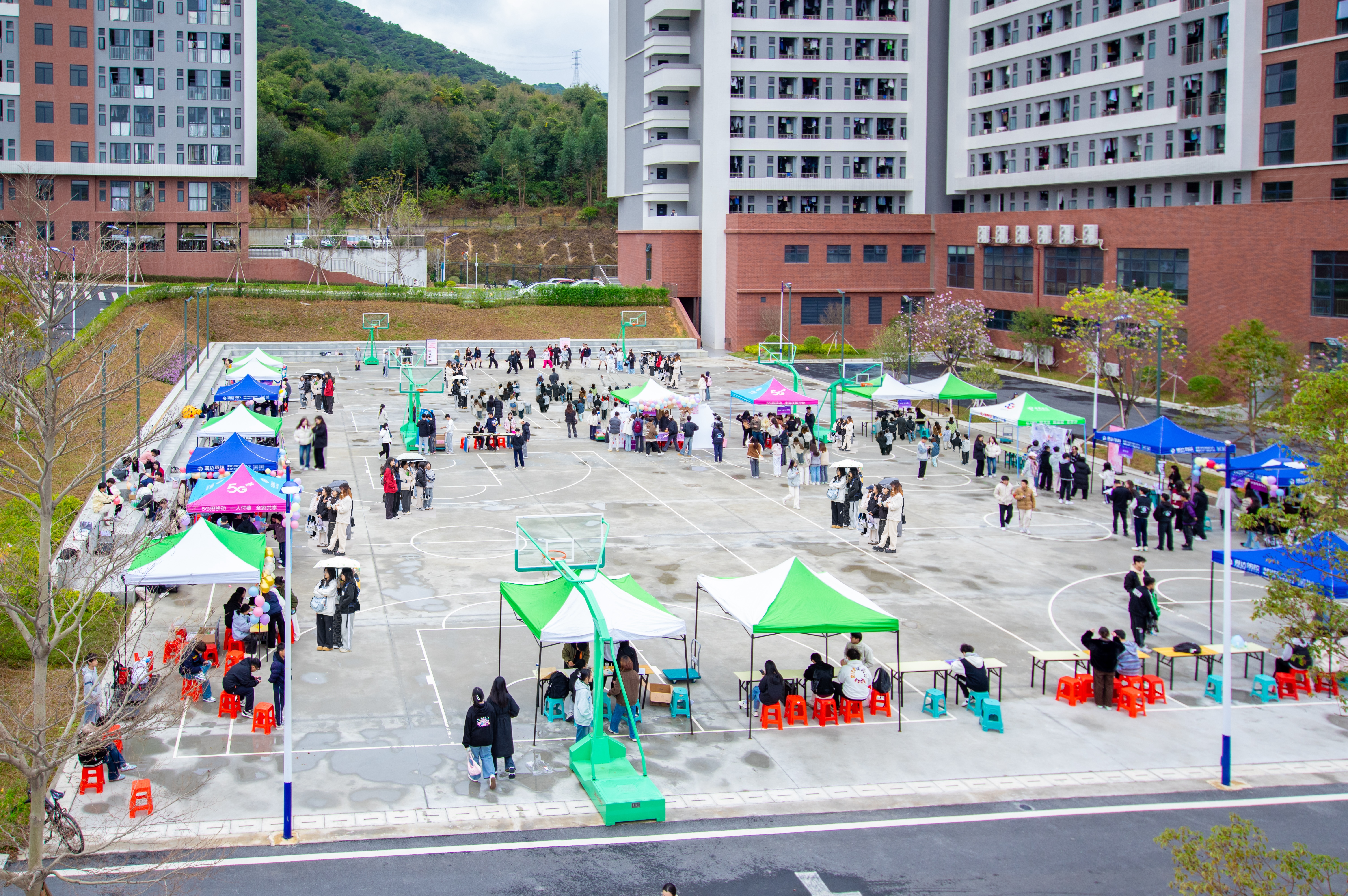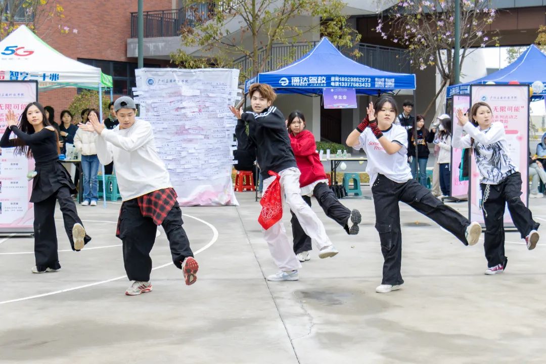 春日绵雨倾洒,微风轻拂面颊。H座旁篮球场处,游园会现场人潮涌动,猜歌、逛三园、数字问答等数个趣味游戏摊位围成一圈,参与者们全神贯注地竞技,满场都是欢快的笑声。随着百余首随舞歌曲的放送,舞者们活力四射的舞步点燃现场氛围,每一个动作都精准到位,流畅的衔接自然又和谐,吸引着众人的目光,令人沉浸其中。