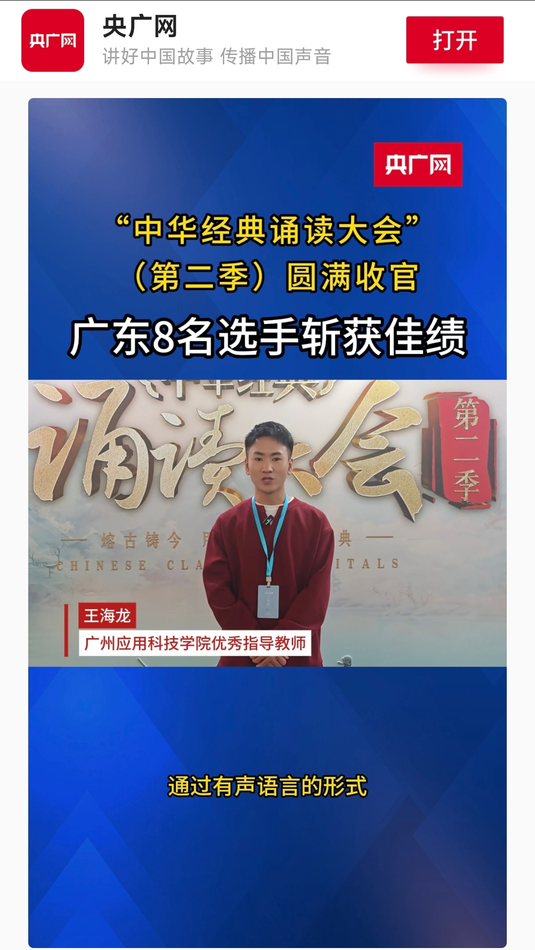 点击图片:回顾广应科专场“中华经典诵读大会”是央广网重点打造的公益文化IP,旨在弘扬中华优秀传统文化,引导全民与经典对话。2023年,央广网特别策划推出第一季“中华经典诵读大会”,这一大型文化展演活动在全国范围内掀起传颂经典的热潮,并被中央网信办评为“2023中国正能量网络精品”。