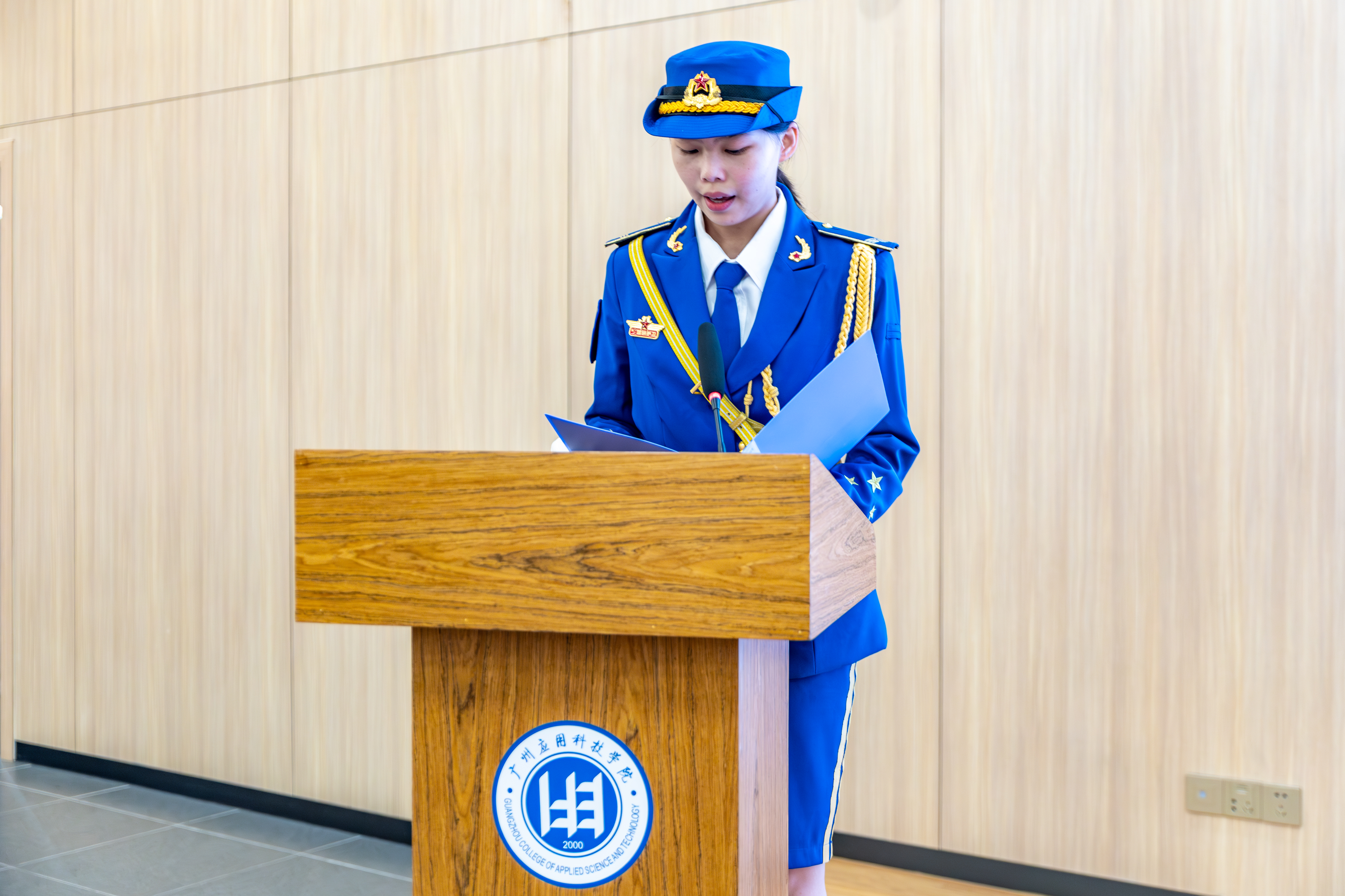 党委武装部干事宋美雪宣读广州应用科技学院第二届国旗护卫队成员名单。每一个代表广应科出征的名字,都象征着守护国旗的责任与使命的传递。