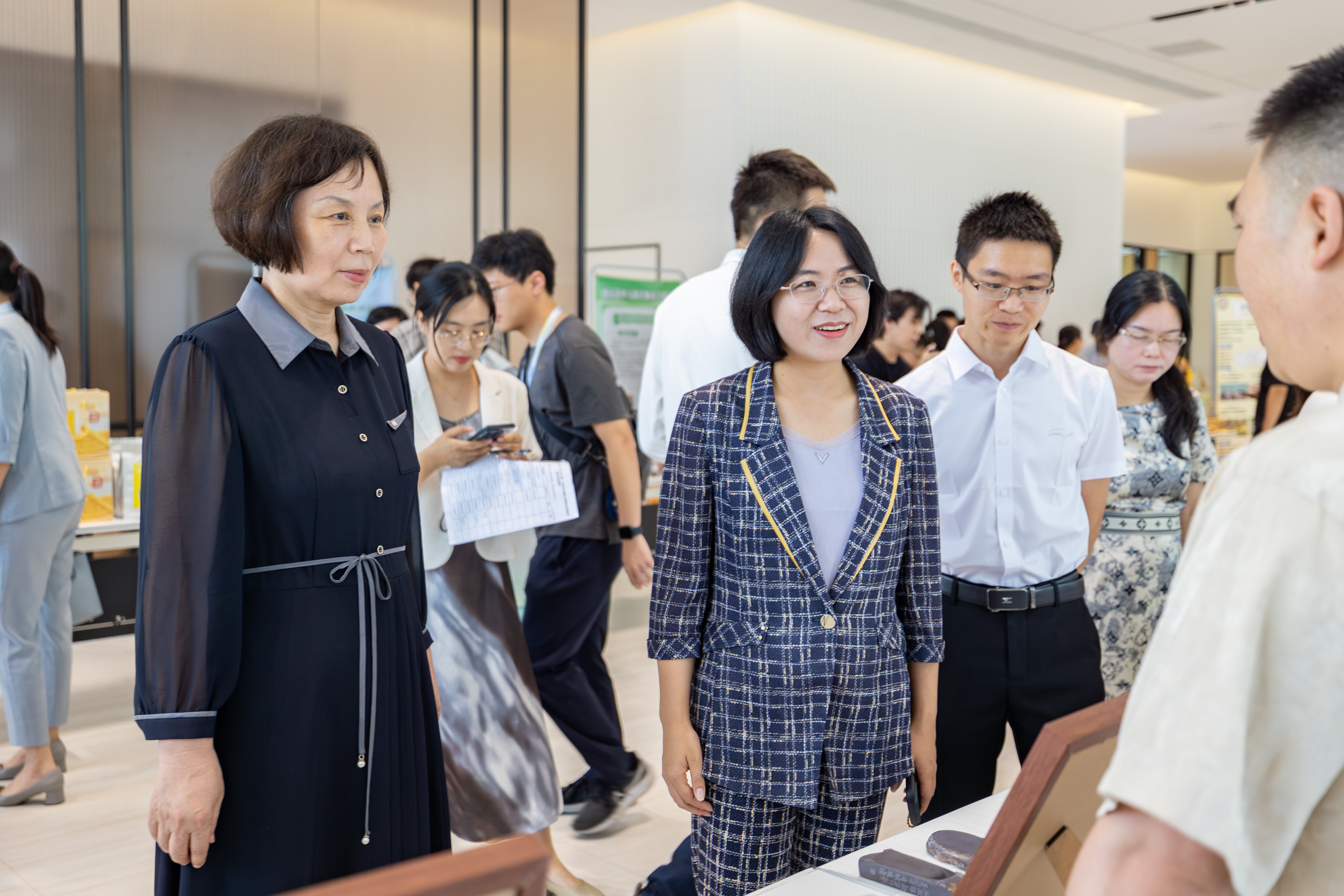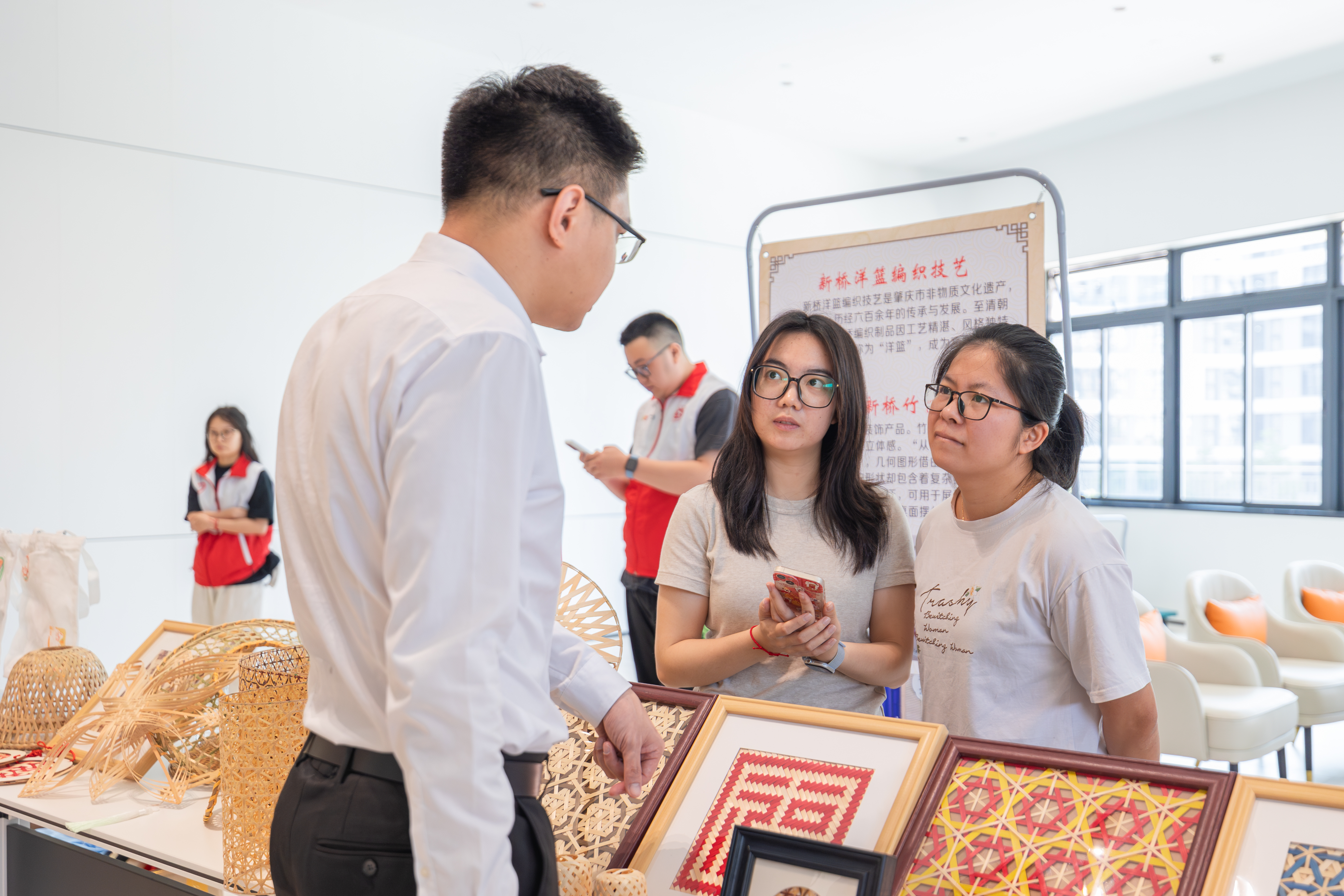 与此同时,兴乡青年创意创业集市在国际会议中心一楼开设。集市展品覆盖着日常生活各品各类,集聚了肇庆市各地区特产。各产品代表热情地介绍各自的展品:端州端砚、四会砂糖橘、广宁云吞,德庆果汁等,展示着青年创意创业兴乡的热情,吸引着在场人员驻足品鉴。