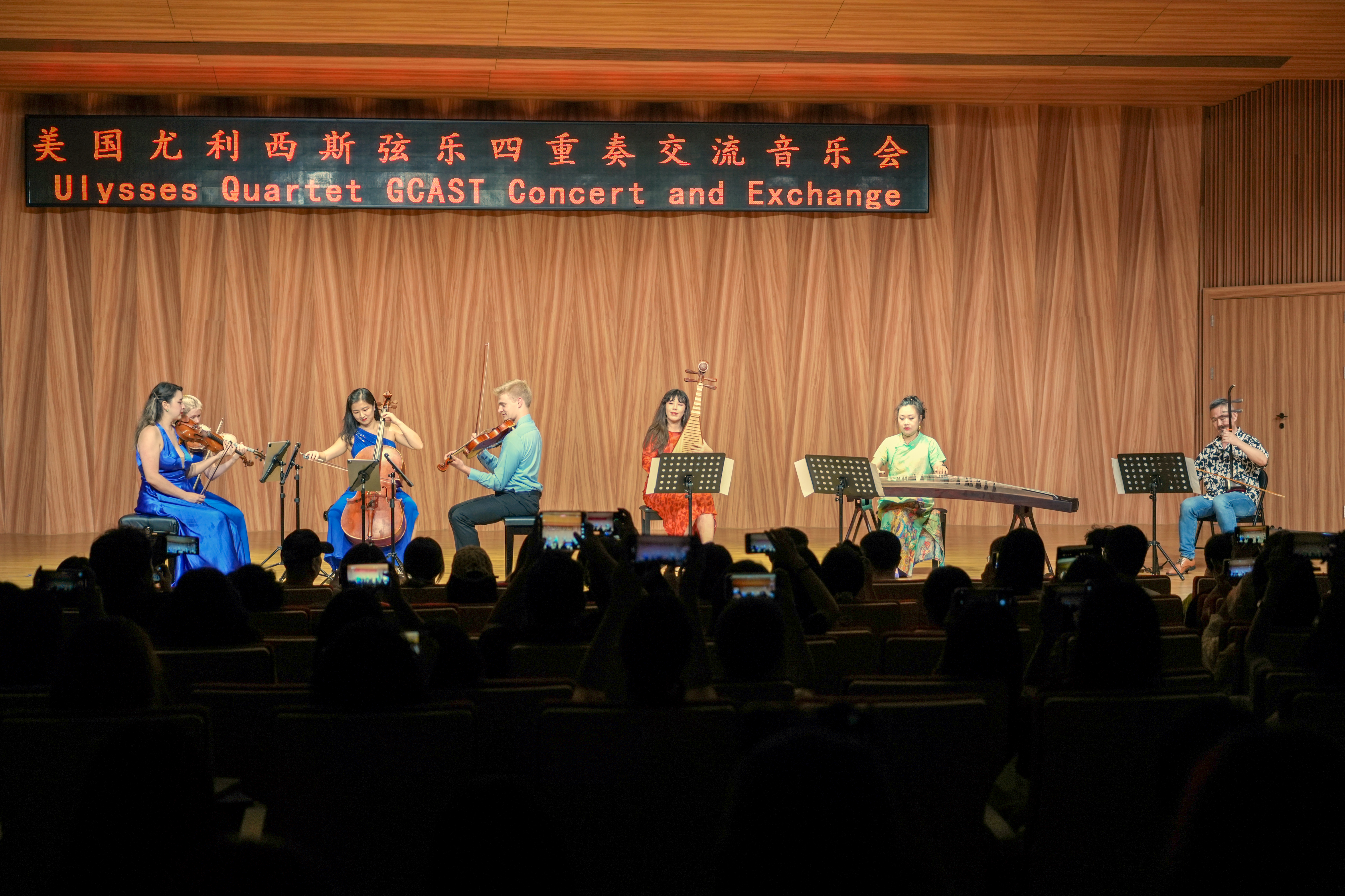 演出落幕,雷鸣般的掌声经久不息,这掌声是对精彩演出的肯定,更是对音乐交流融合的期待。同学们纷纷走上舞台,与演奏者们合影留念,在随后的签售会上,美国尤利西斯四重奏表演者热情地与同学们交流互动,让音乐之外的这份艺术共鸣,在彼此心间流淌。