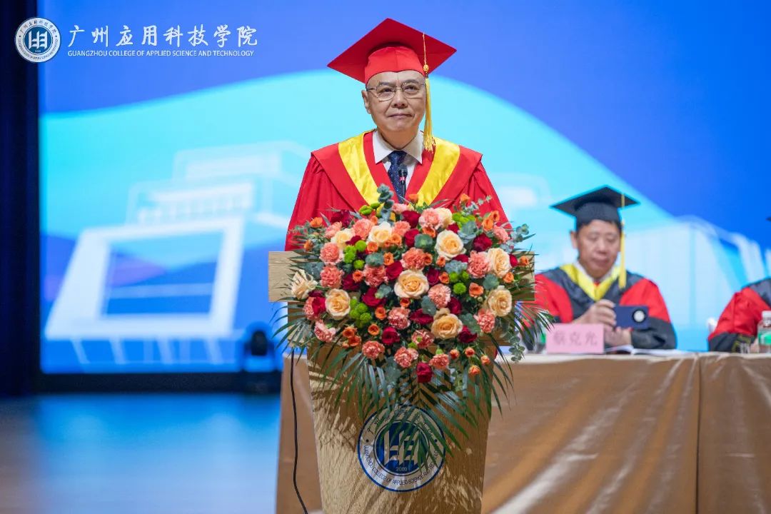校长张光宇首先代表学校向圆满完成学业的8924名毕业生致以热烈祝贺,并向辛勤付出的老师、家长们表示崇高敬意和诚挚感谢。他深情回顾了学校在“十四五”期间取得的跨越式发展成就:连续四年入选“软科中国民办高校全国百强”,获批多项国家级、省级重要平台与荣誉;人才培养硕果累累,学生在“互联网+”等大赛中屡创佳绩,就业率持续领先;形成了具有广应科特色的“快-新-高”发展态势。