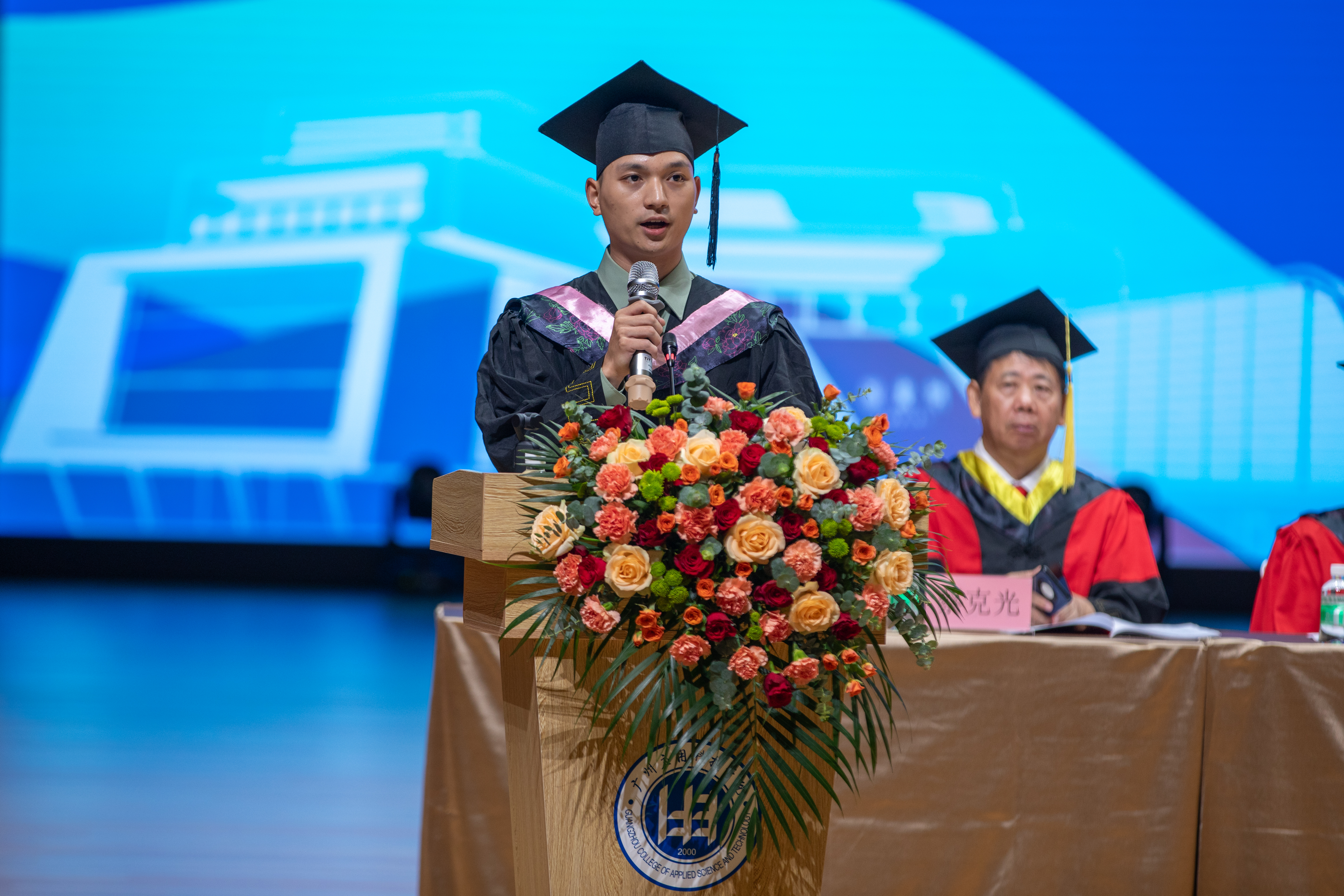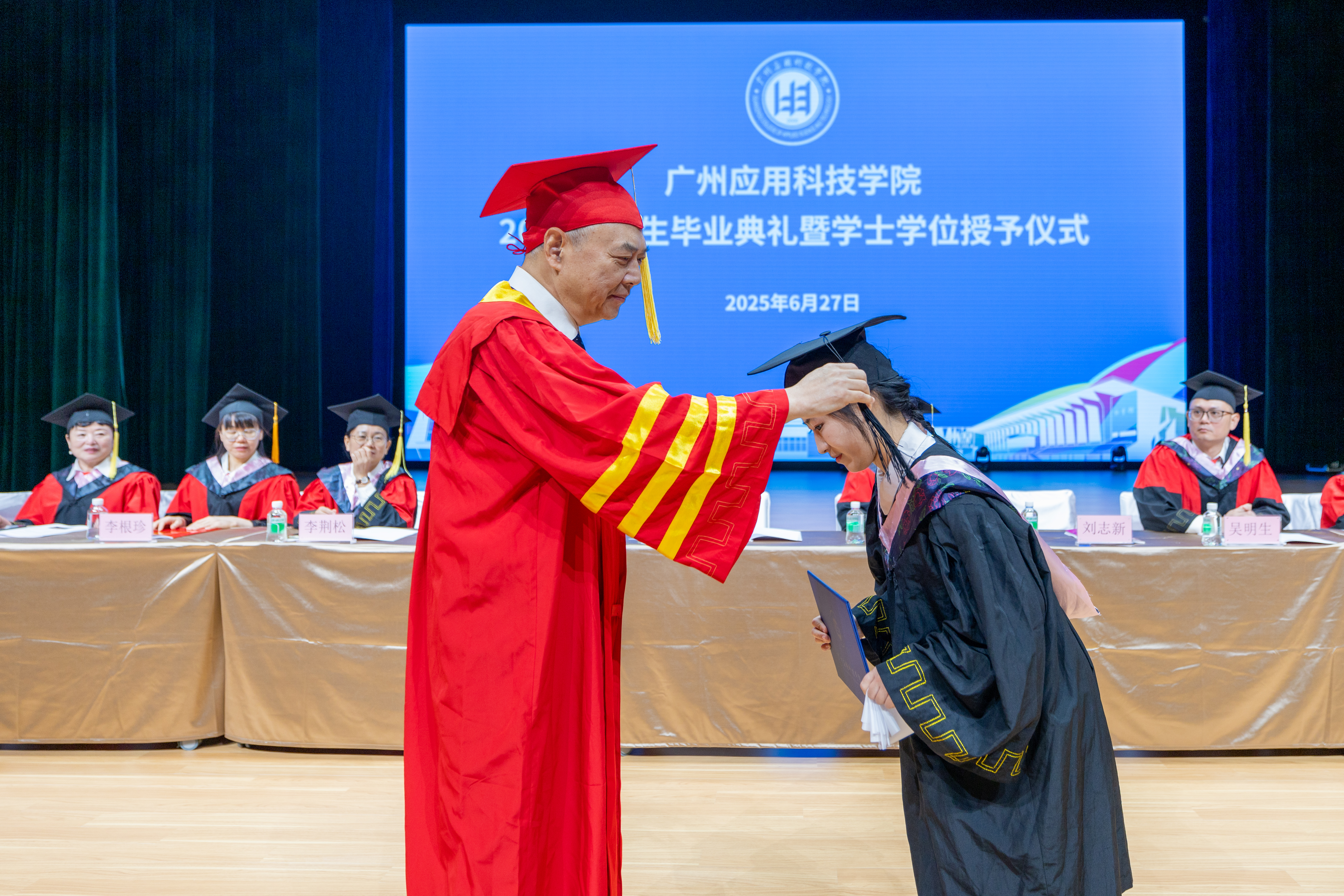 校党委书记陈光团宣读了《广州应用科技学院关于表彰2025届优秀毕业生的决定》,对品学兼优的学子予以嘉奖。校长张光宇为优秀毕业生代表颁奖。常务副校长吴舸先后宣读了《广州应用科技学院关于准予倪志锐等8796名全日制本科学生毕业的决定》及《广州应用科技学院关于授予倪志锐等8796名全日制本科毕业生学士学位的决定》,标志着学子们圆满完成学业。