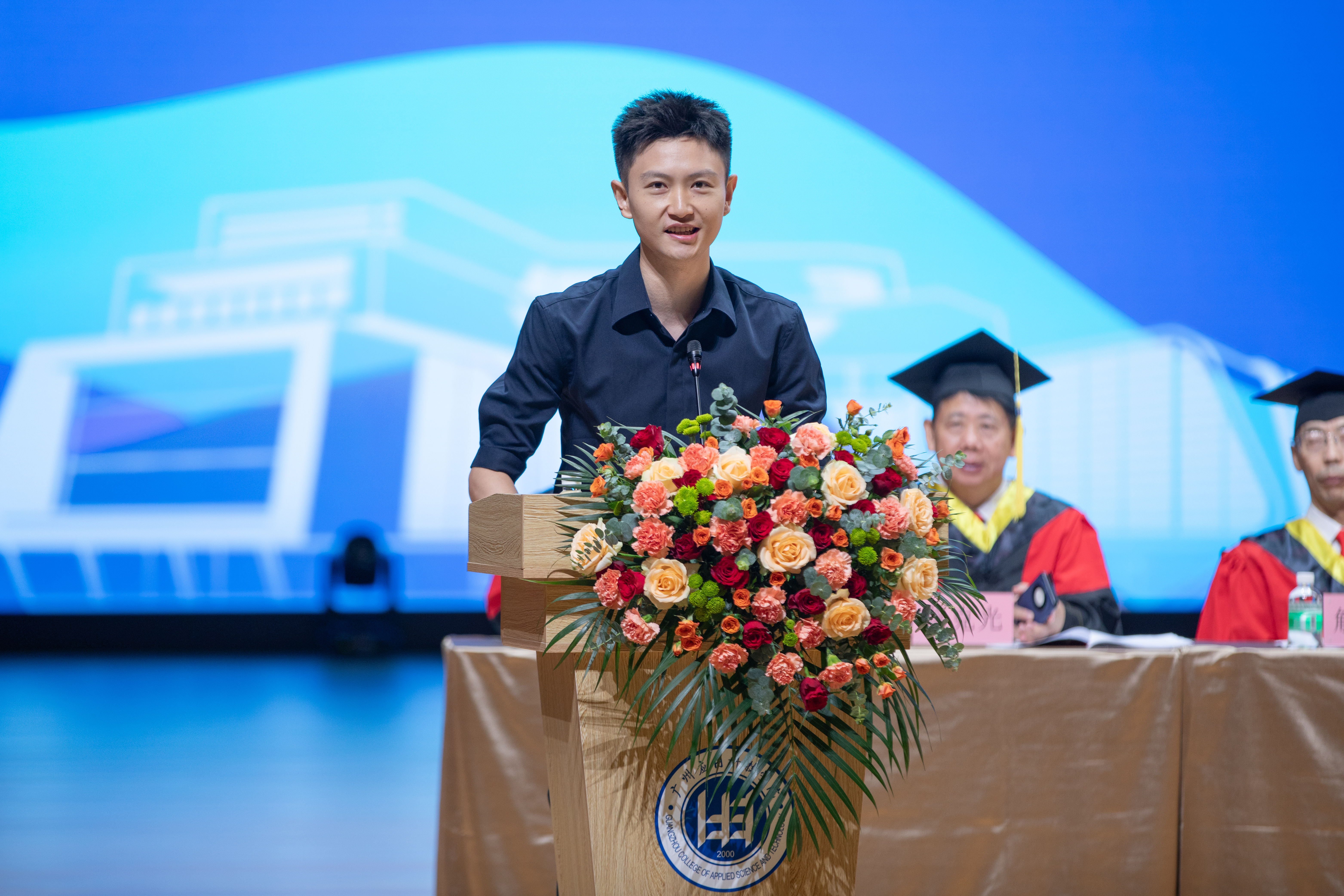 青春印记里,感恩相伴,定格芳华。来自文学与传媒学院的教师代表钟远,深情回忆了与学生们共同度过的点滴时光,传递了师长的殷切期望与不舍祝福;体育科技学院2025届毕业生林志乐代表全体毕业生发言,表达了对母校、师长和同窗的深切感恩与对未来的坚定信心;2025届毕业生黄铄然的家长曾小红女士作为家长代表,分享了见证孩子成长的欣慰,并对学校的悉心培养表达了由衷的谢意。