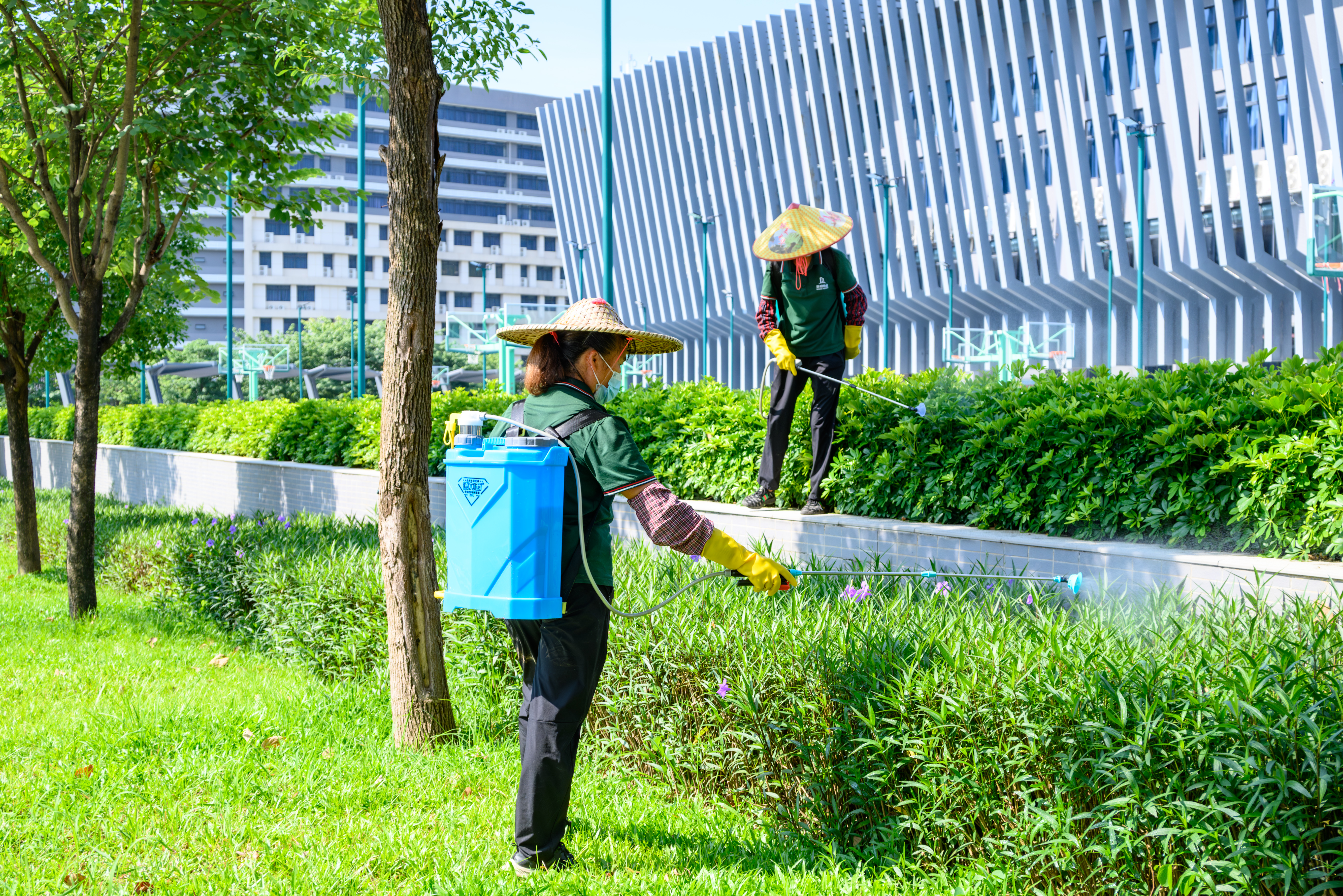 行动号召一经发出,广应科师生迅速响应,学校总务后勤服务人员和全体赛会志愿者投入到这场校园“健康保卫战”中。志愿者们不畏酷暑,分工协作,环境消杀组聚焦体育馆、交流中心、绿化带、下水道、阴暗角落等重点区域,科学选用环保药物,实施空间喷洒与滞留喷洒;针对无法清除的积水,精准投放灭蚊幼缓释剂,作业人员全程规范穿戴防护装备进行操作。各区域清洁组(平面清洁组、场馆清洁组、交流中心清洁组、食堂清洁组、后勤办公区域清洁组)同步对责任区开展深度清洁整治,重点清理路面垃圾落叶,清除花盆托盘、坑洼、废弃瓶罐等各类积水容器,填平坑洼,疏通沟渠,彻底清理楼梯间、地下室、设备间等卫生死角,并严格落实垃圾日产日清、密闭管理,从源头上铲除蚊虫滋生环境。志愿者工作组积极投身一线,协助平面清洁组和场馆清洁组,深度清扫体育馆内外及校园公共区域,清理积水,清除垃圾杂物。宣传报道组全程记录行动过程,并利用“云之家”、电子屏、微信群等平台广泛发布宣传资料,向师生普及基孔肯雅热、登革热防控知识及防蚊灭蚊方法,倡导师生做好个人防护,包括使用驱蚊剂、穿着长袖衣物、安装纱窗纱门等措施。