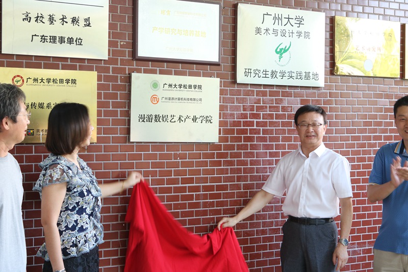 松田网讯(记者:黄佩珊 学生记者:刘建伶 陈渊 黄宁)10月24日,我校在教学楼七八栋广场举行艺术传媒系校企合作成立漫游数娱产业学院挂牌仪式,随后在行政楼七楼会议室召开交流座谈会。广州大学松田学院副校长李江凌,广州漫游计算机科技有限公司总经理杨晓微,广州漫游计算机科技有限公司项目经理钟启鸿,艺术与传媒系主任贺锋林等参加。