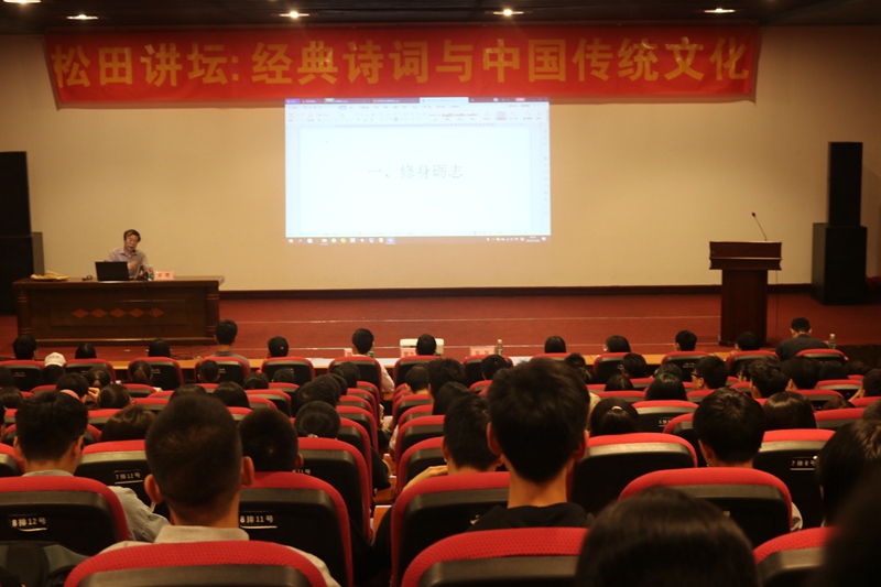 松田网讯(记者:黄佩珊 学生记者:叶晓婷 谢祖娴)11月26日下午,我校在行政楼多功能厅举办了以“经典诗词与中国传统文化”为主题的松田讲坛专题讲座,发展规划处处长吴晟教授担任主讲。校党委副书记、纪委书记裴九雄,校党委办公室主任陈贤明,以及学生代表参加了讲座。本次讲座由学生处副处长郭振主持。