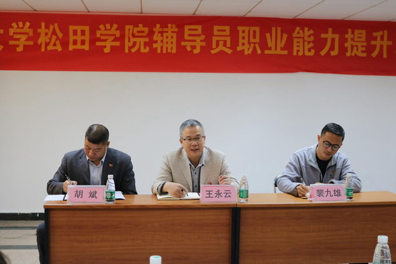 党委书记王永云和副书记裴九雄到培训现场进行动员指导。党委书记王永云对学工部安排的培训内容表示肯定,他要求学工队伍要深刻认识习近平总书记关于高校思想政治工作一系列讲话精神的丰富内涵,精确研判目前大学生思想政治工作的形势,明大势识大局,提高政治站位,面对问题要敢于亮剑,充分发挥学工队伍在政治、组织、宣传及思想引领方面的优势。副书记裴九雄要求,学工队伍要充分认识培训的重要性,利用培训的机会互相交流,共同分析辅导员工作中遇到的问题与解决办法,做到全员育人、全方位育人,进一步推动松田学工队伍的壮大与发展。
